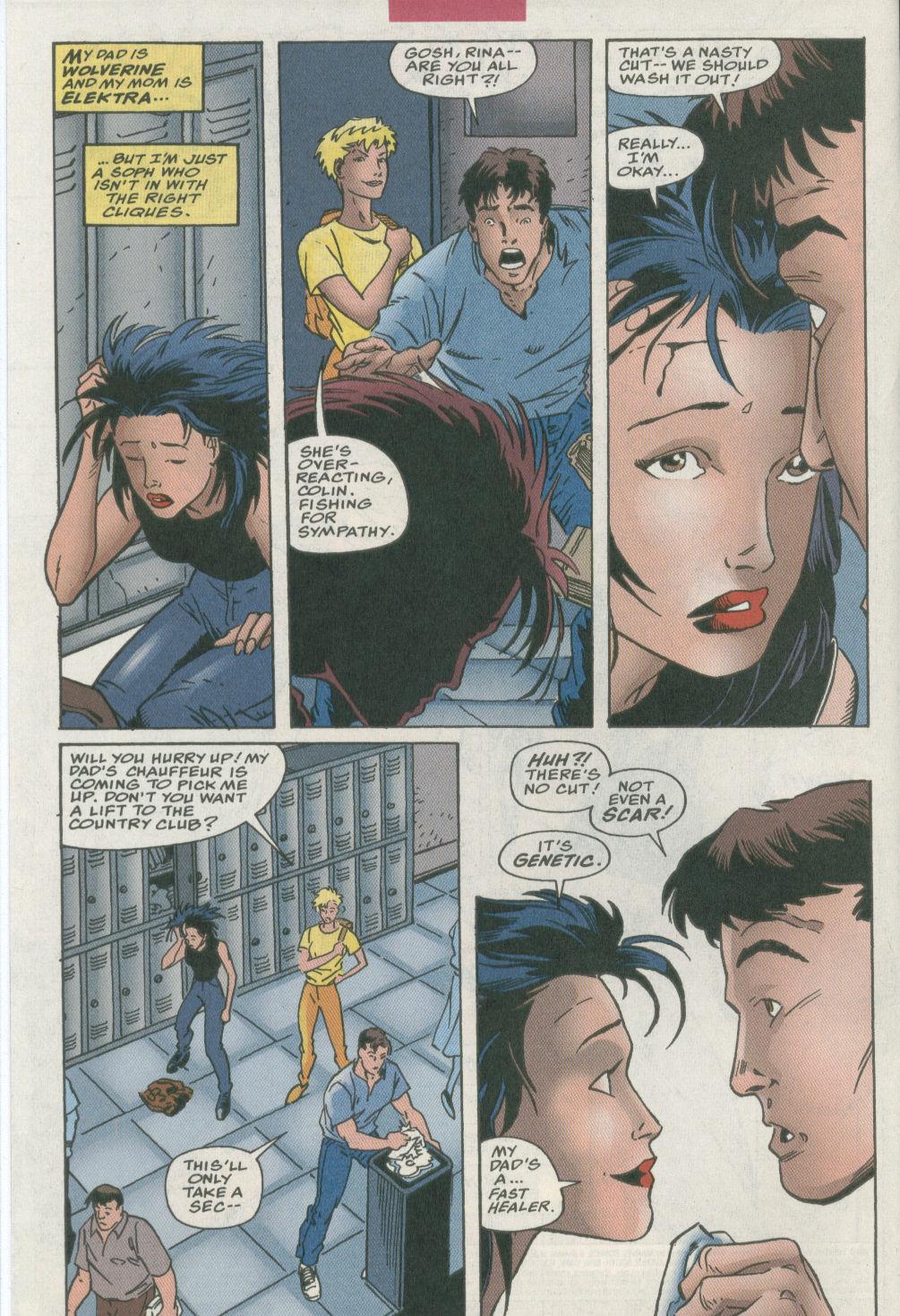 The one thing I found odd about Wild Thing is how Larry Hama wrote Rina acting so incredibly low-key while at high school. I mean, her father is Wolverine and her mother is Elektra, two of the most dangerous people in the Marvel universe. Rina herself is a fast, powerful mutant who was shown to be very imulsive and, well, wild in the pages of J2. With that parentage and those powers, you would think that if some snotty rich girl like Cameron slammed Rina’s head into a locker as a sick joke that Rina’s first impulse would be to disembowl her! Or, y’know, at least kick her ass. I guess Rina has more self control than her old man, who is infamous for his hair trigger. “Nobody laughs at the Wolverine!” and all that 🙂