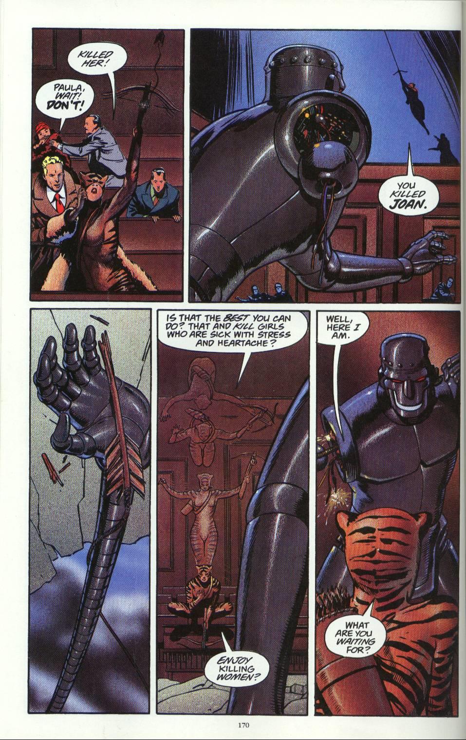 Robotman vs. Tigress seems a one-sided affair, but how could one not admire the vehemence with which Paula Brooks attacks the steel monstrosity in the name of vengeance for her friend? Despite how Robotman just murdered her pal with nary a second thought, Tigress is displaying nerves of steel that despite being made of metal, Robotman could only wish he had.