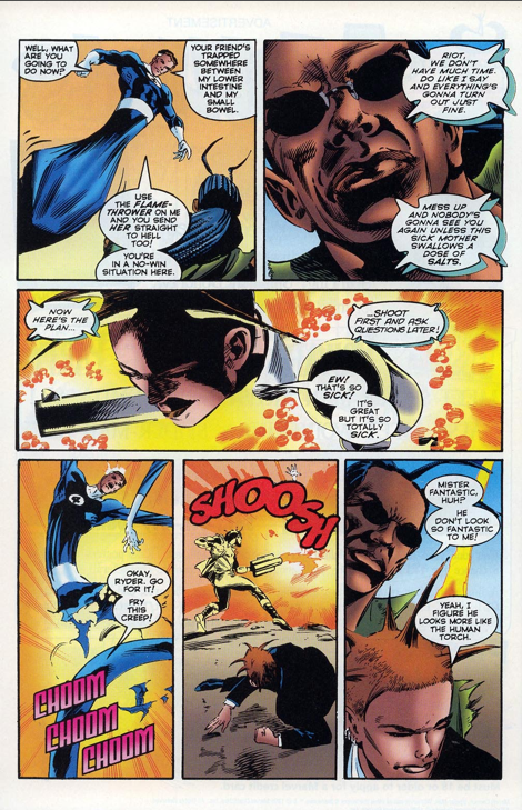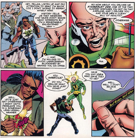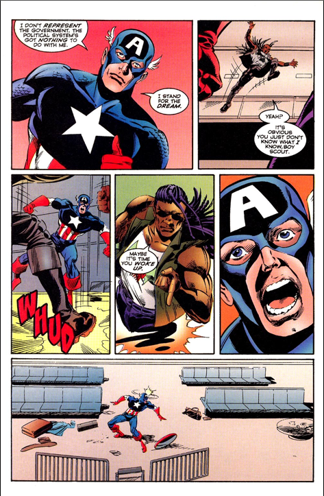 The last reason would make the most sense to me because it would explain the diatribe below by Ryder that doesn’t really fit into the rest of the book otherwise. I can tell I’m no longer my younger cynical 90’s self because instead of thinking, “Yeah, you tell that old jingoistic bastard!” I just wanted to yell at Ryder not to talk to Captain America that way. I also want to balk at the idea that he could handle Cap so easily, but I suppose this is his comic and all.