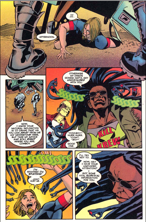 One other thing the Krew does is recruit new members, but considering their recruitment techniques don’t look terribly different than their Skrull extermination techniques, their potential members can be a little reluctant. Dice, a surfer dude who has been experiencing strange visions and mood swings, runs from them, quite understandably so, as the Krew has shot his girlfriend after announcing themselves as “two seriously violent individuals” and started chasing him down with all the subtlety you would expect from people who mow down alien infiltrators in crowded public places.