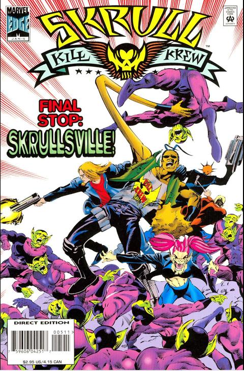 Greeting, Legions, and welcome back to Madness Month here at The Unspoken Decade! I don’t know that I truly understood the meaning of the word “madness” until I experienced a certain ongoing basketball tournament Dean Compton-style, complete with days of games on multiple screens and more junk food than anyone in their right mind would ever consume, but now I am well prepared to take a look at some lunacy in the comic book realm. If you haven’t already, I strongly encourage you to take a glance at Dean’s take on Ghost Rider #33 and Darry Weight’s Venom: The Madness, but if you’re in the mood for madness of a slightly more irreverent nature, there’s no better place to turn than 1995’s Skrull Kill Krew.