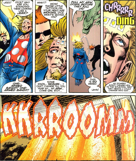 I hope when I keep saying that there isn’t much going on plot-wise that it doesn’t come off too disparagingly because the other thing completely lacking in Skrull Kill Krew is pretense. It never once tries to be something it’s not, not for a moment, so while it’s most decidedly not a masterpiece, it most certainly is what it sets out to be, which is a rollicking good time. The sort of comic where you can kick back and enjoy some wanton destruction and not bat an eye because someone’s powers, which they acquired by eating ground up alien, cause them to turn into a human slot machine whose jackpot is becoming pure energy. Yes, that happens: