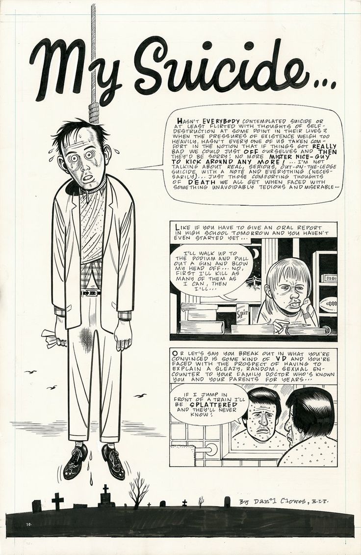 As “phase one” of Eightball, anchored as it was by “Like A Velvet Glove Cast In Iron,” gave way to the more pre-planned, formalized (damn, I’m making that sound like a bad thing, but it wasn’t) structure of “phase two,” which was tethered to the ongoing exploits of Enid and Rebecca in “Ghost World,” (which we’ll be coming to in, I would imagine, the not-too-distant future here) the short-form stories also “grew up” a bit, incorporating elements of the decidedly bleak nature of the aforementioned “My Suicide” and “A Message To The People Of The Future,” but transposing them into actual stories about actual characters rather than coming at us directly from the mouth of the artist himself in “graphic rant” form. It made for a welcome switch, and led to some genuine classics, but we’re probably getting just a bit ahead of ourselves at this point if we delve into them too deeply.