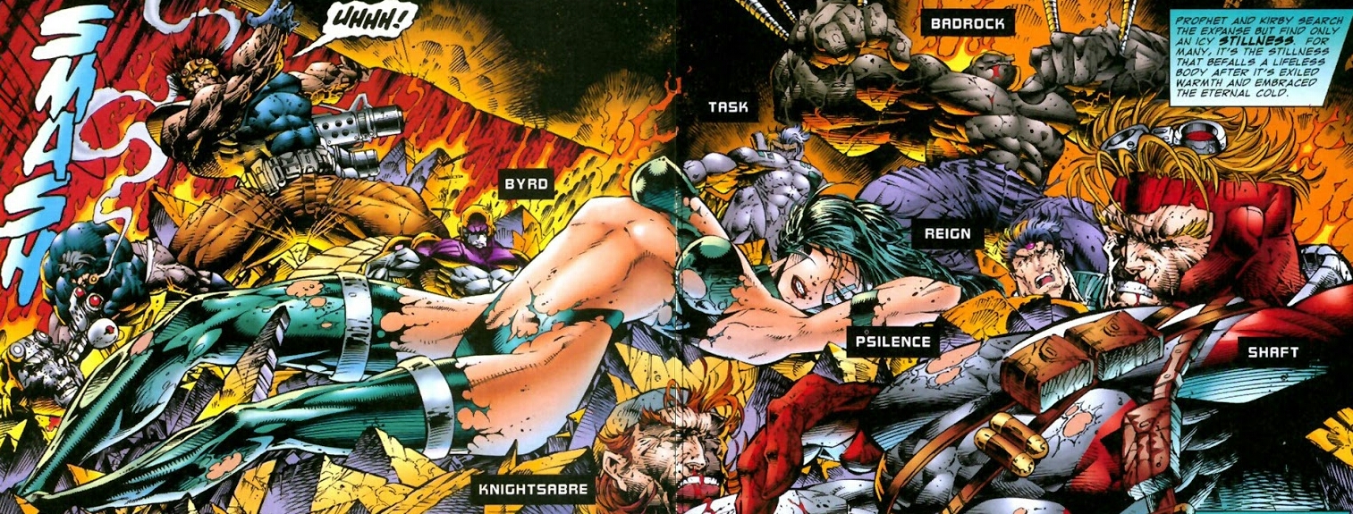We begin our final chapter with Prophet and Kirby sifting through the rubble of Youngblood’s headquarters. What happened, you ask? Crypt happened. Kirby senses something alive beneath a downed pillar. Using his enhanced strength, Prophet lifts it free, revealing the battered and broken forms of the members of Youngblood! The two men leap to action, carefully removing the heroes from the debris. While Prophet continues this, Kirby discovers a bloody shuriken. He hands it to Prophet and comments how he himself fashioned his throwing star long ago. But then how does Crypt have it in his arsenal? (Curious. Not how Crypt had the weapon in his possession, rather how Kirby could tell it was of his creation! Did he leave his damn initials on a throwing star? Who does that?)