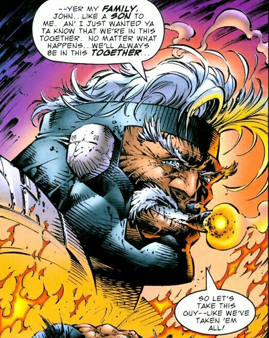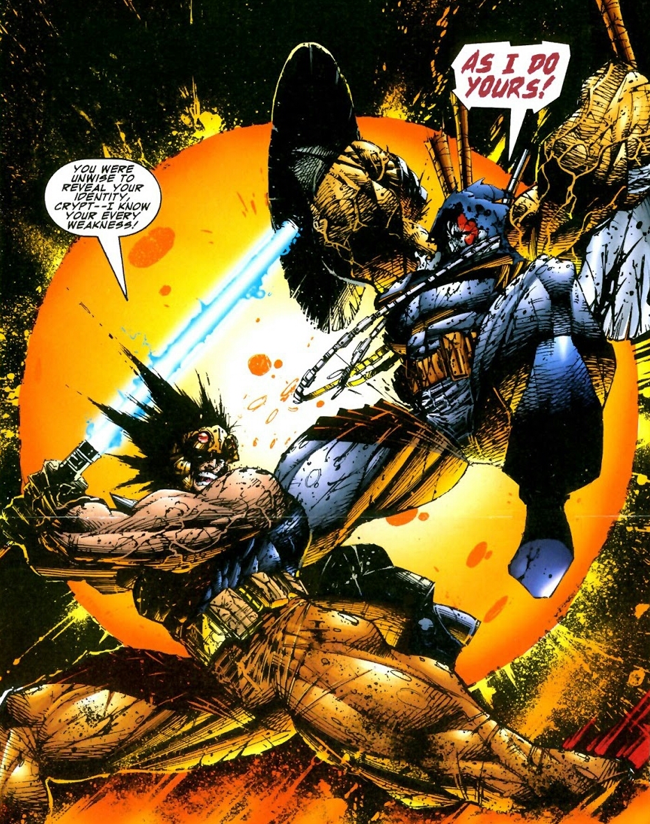Shock quickly becomes rage and Prophet roars like a mighty lion, striking at his nemesis! The two men savagely beat one another to bloody pulps, neither gaining the distinct advantage! Finally, Prophet manages to knock Crypt down and pins the beast to the ground! He knocks the bloodied battleaxe out of reach and tears the hood from his enemy’s face, revealing his own face beneath! Though the hero knew the truth in his heart, seeing the truth face to face shocked him nonetheless. (Didn’t see that coming, huh? Kinda like when Vader was revealed to be Luke’s father! What’s that? You saw this coming a mile away? Umm. So did I. Way too simple to figure out really….damn kids today….)