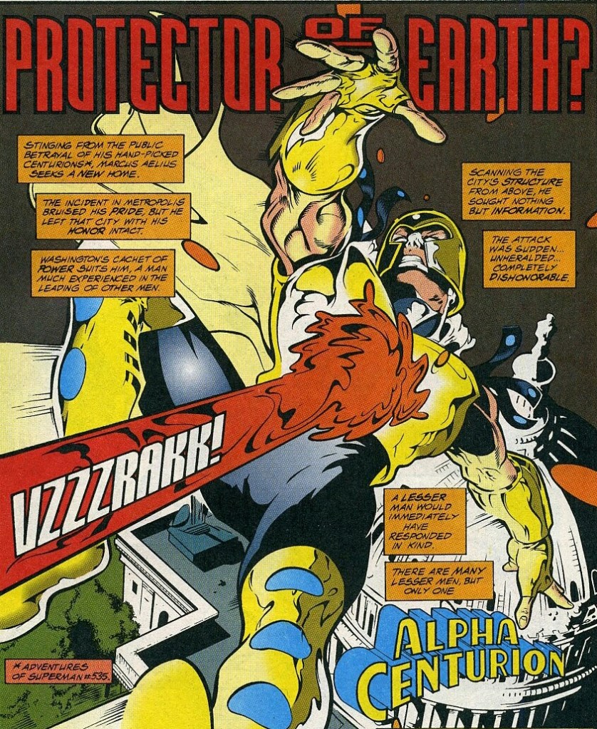 With my Prophet series now at a close, I thought I’d return to DC Comics. And what better way to usher in my triumphant return than to write about a character that I personally feel deserves more respect, the Alpha Centurion? What’s that? Who’s the Alpha Centurion? You see, that’s my point. This character made a large impact in the pages of Superman’s titles. He was even a member of the famed “Superman Family”! But, like many characters in the 90’s, he pretty much disappeared as if he never existed at all. So, join me as I take a look back at the Alpha Centurion Special! (Damn! I rambled way too much! I wonder if anyone’s still reading this?)