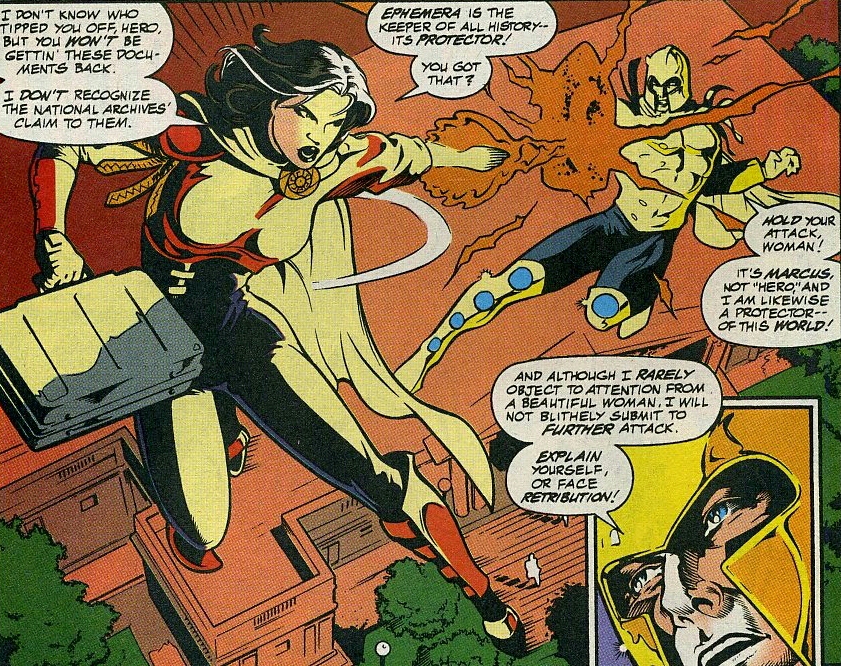 The hero quickly recovers and retaliates. He flies in quick, energy blade and shield at the ready! As he attempts to grab the misguided villain, he passes right through her! (Women! Always playing hard to get!) She states that she will have these documents and they will be added to her personal library in order to better preserve history. Not to be defeated, he quickly takes another airborne pass. Same result! It’s then that Ephemera recognizes him. She exclaims that, as a Roman soldier of days long past, he is a piece of living history! He exclaims that He will not be added as a relic to her strange collection. But, she replies that she has other uses for him in mind! (Oooooh! Me thinks someone’s about to get a supervillain booty call!)