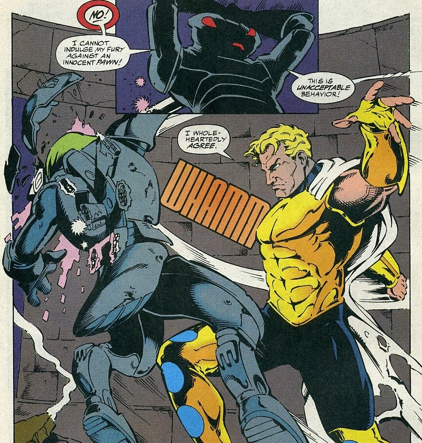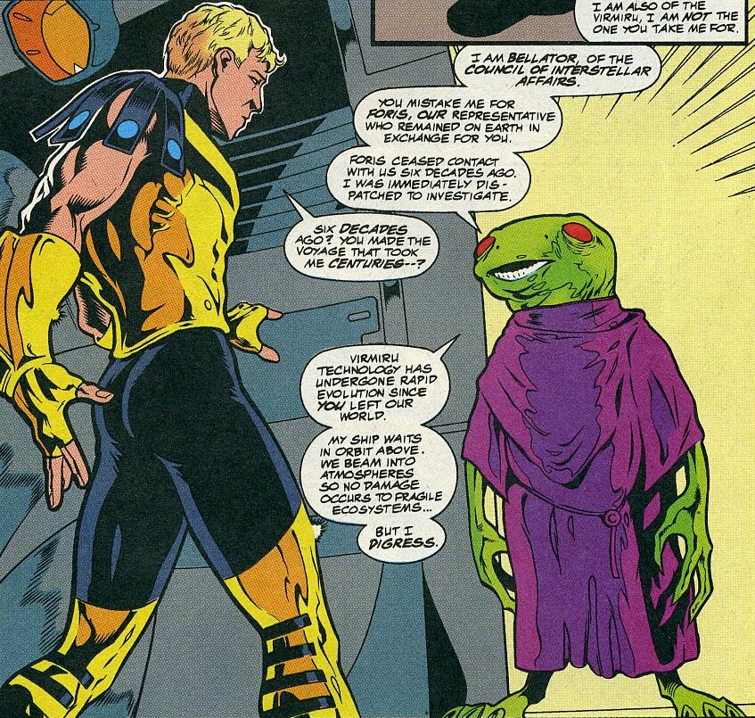 And so it was to the city, Metropolis, that he first re-entered the human race. The first being he met was of course the legendary Superman. It was even he and the reporter, Lois Lane, that gave him his new name, the Alpha Centurion. (End origin flashback. And what have we learned, boys and girls? If a stranger offers you a ride into space to become a mighty superhero, go on and take a chance. Sheesh! The dude’s lucky he didn’t end up on ancient Roman milk cartons!) The Centurion is brought back to present day by a man requesting he go with him. The Virmiru will see him now.