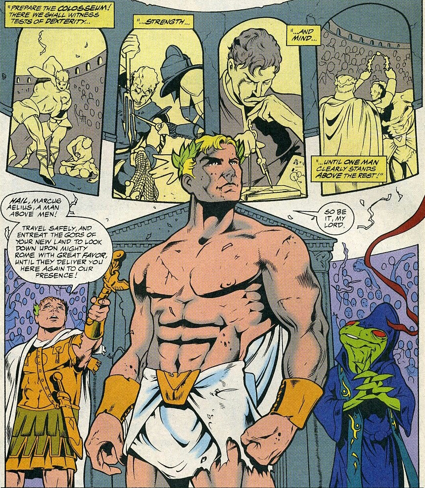 Unsure, the Alpha Centurion at last agrees. That night, the rebel alien receives the coded message that the others of his kind left for him. It calls for a meeting. He accepts but wishes for it to be at a place of his choosing, a formal event for the upper class of D.C. Shedding his armor and weaponry, Marcus Aelius attends the strange meeting place. Even though he appears as one of them, he is still noticed by all for his role as a very public superhero. A female press agent even approaches him and begins talks of representing him. Her words fall upon partially deaf ears however as the hero spies a statue from his era on display. He soon loses himself in thought. (Uh-oh! I sense an origin flashback coming on. We’ll let him get away with it this time though. It’s not like Spider-Man doesn’t do this every ten pages or so and nobody seems to care!)