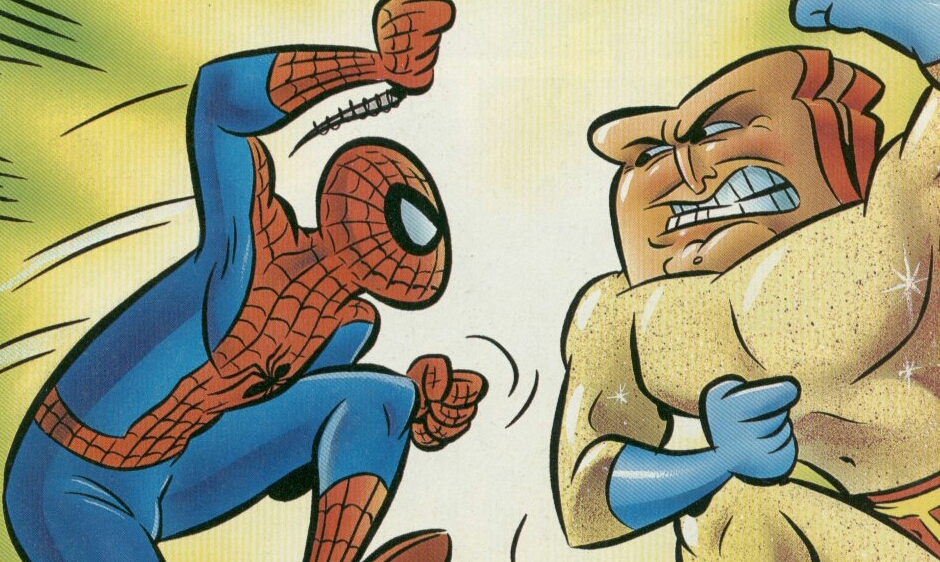 Now that the danger has passed and the villain lies beaten, Ren and Stimpy run out to meet the two superheroes. They exclaim how the two of them should really make their partnership more permanent as they just worked so well together. Spider-Man replies that a superhero of Powdered Toast Man’s caliber just isn’t in the same league as a seasoned veteran like himself. This causes the Breakfast Avenger to lash out verbally to defend himself. Soon, an argument escalates about just who would actually win between the two of them in a fair fight. Powdered Toast Man then sucker punches Spidey through a nearby brick wall.
