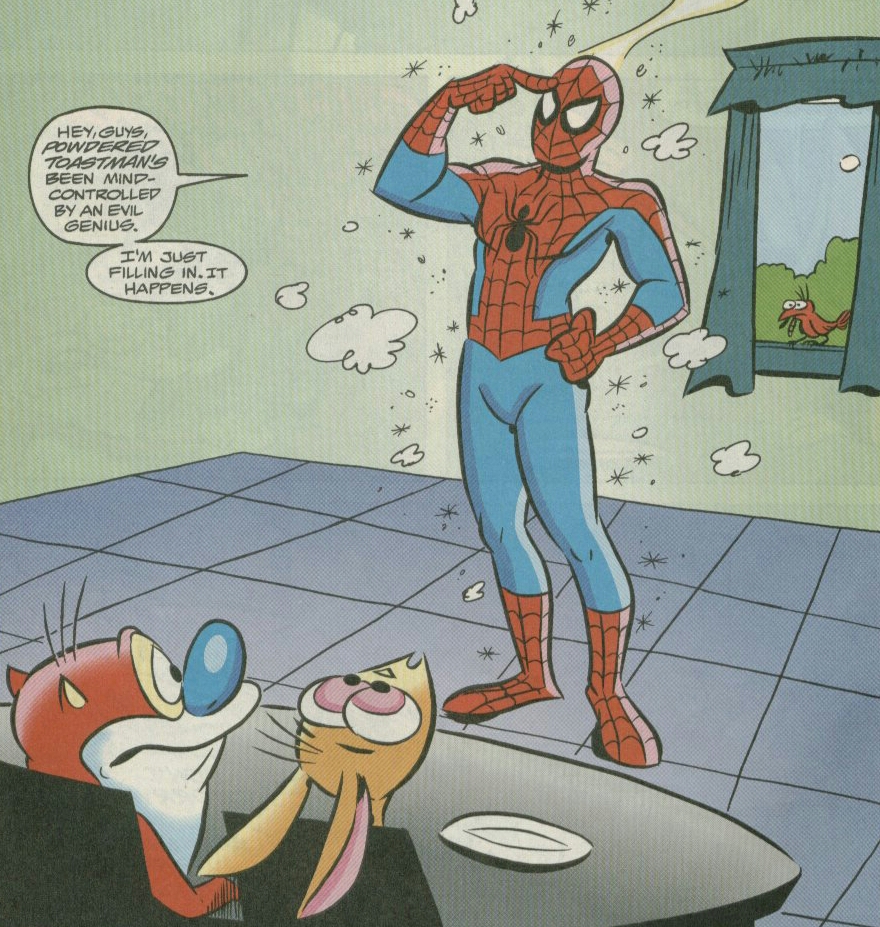Our story begins as 90’s cartoon characters, Ren and Stimpy, sit down at their kitchen table to enjoy their favorite breakfast, Powdered Toast. But what’s this? The can is empty. No reason to panic though. Stimpy dons a peculiar-looking headset and calls out over a large microphone for the assistance of none other than Powdered Toast Man! He’ll fix this problem in no time. Suddenly, the kitchen curtains blow with a mighty gust of wind and Ren and Stimpy await the awesome entrance of their hero! But strangely enough, Spider-Man has appeared instead! (What’s this? Why Spider-Man? Does Disney know about this unannounced cameo appearance? In a comic book that spotlights Nickelodeon animated stars no less? Gasp! Better watch out or this intellectual property will be acquired next!)
