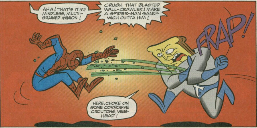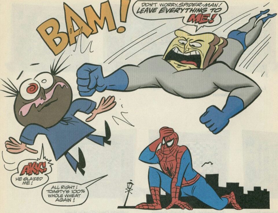 P.T.M. wastes no time! He unleashes a barrage of high-speed croutons from his armpit, stunning the web-slinger! Spidey quicklly recovers and responds with a powerful left hook to the other hero’s toast-shaped face! Seemingly unaffected, Powdered Toast Man fires an onslaught of raisins from his mouth! The bullet-like projectiles are halted however by Spider-Man’s webbing! Still under the villain’s evil control, P.T.M. blasts razor-sharp, stale toast slices at the wall-crawler! Spidey uses his spider-sense to dodge every one of the deadly weapons, advancing on his friend-turned-enemy! When he’s close enough, Spider-Man hits Powdered Toast Man with all of his strength! While stunned, he then follows this attack with a powerful blow to the other hero’s stomach! The Breakfast Avenger falls at last! (You should all know that this is by far the strangest thing I have ever written!)