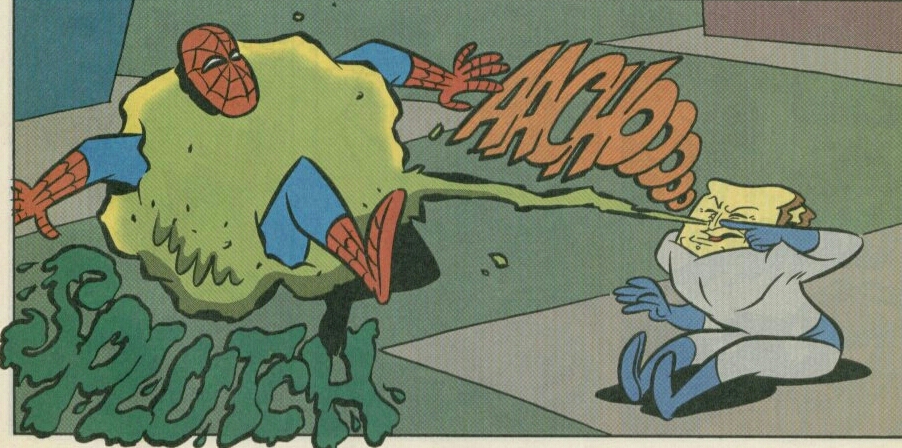 But what’s this? Powedered Toast Man isn’t finished yet! No, he has one more trick up his crusty sleeve! Using a finger to block one of his nostrils, he blows with all of his might, unleashing a devastating attack at an unprepared Spider-Man! He has unloaded a mucus-like fluid that has completely encased Spidey. As this sticky dough begins to quickly dry, it hardens like stone! Spidey finds that movement has become quite impossible! Has evil truly won the day? Will Powdered Toast Man forever be a servant to the evil Dr. Dough-Naught? (Will Symbifan finish writing a single article without chain-smoking an entire pack of cheap cigarettes?)
