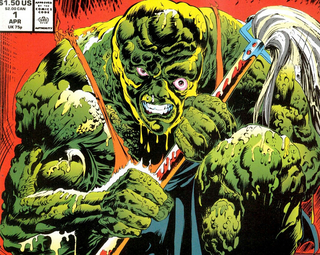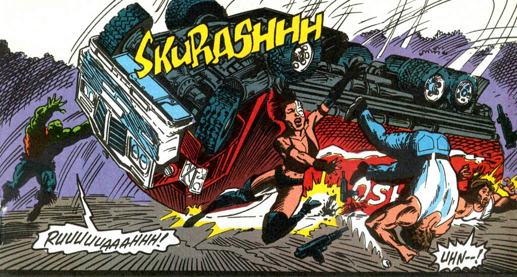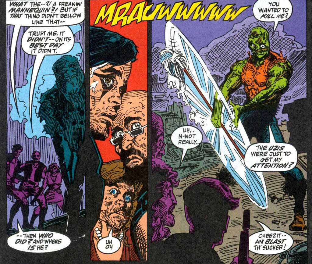 Carrying only a mop, the creature crawls through the disgusting refuse of the barren junkyard. Confusion taints his every thought. Where is he? Who is he? All he remembers with clarity is excruciating pain. He happens upon a beaten-up, old car. Looking at his reflection in the vehicle’s broken window, he sees a grotesque monster looking back at him! He lets loose an unearthly roar that echoes throughout the garbage dump! Not far away, a trio of street thugs jump at the frightening sound. Leaving the warmth of their flaming barrel, they check their guns and go to investigate. The monster’s body is suddenly bombarded with an intense tingling. He somehow knows that evil approaches. (I get that buzzing feeling too. It’s usually caused by too much caffeine and followed by a sugar crash that involves me snoring away for hours. The only evil that follows is a stomachache and a mad dash to the bathroom.)