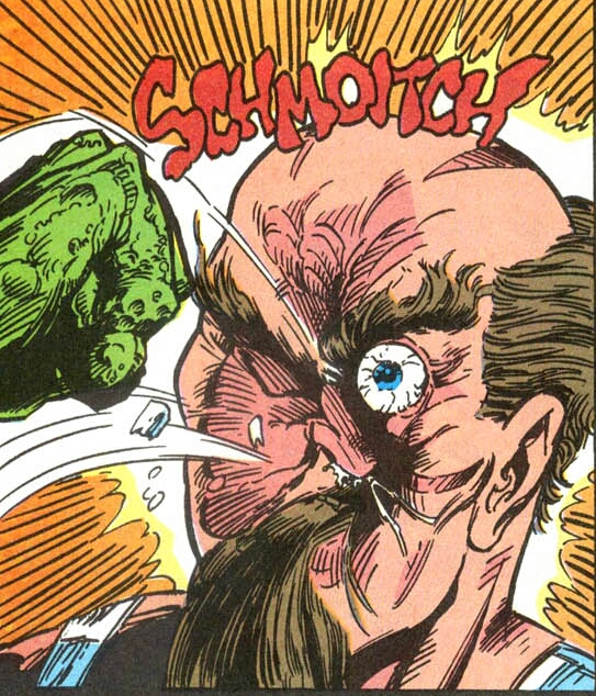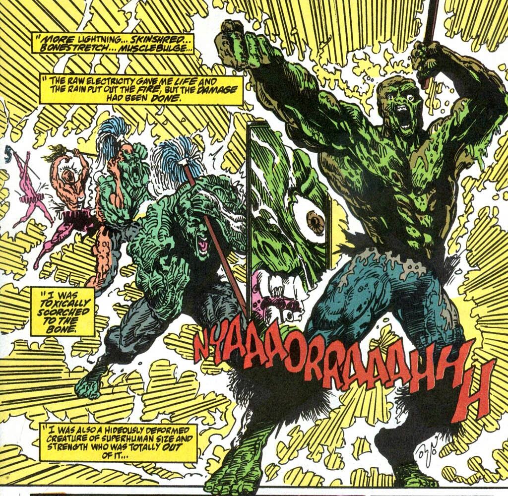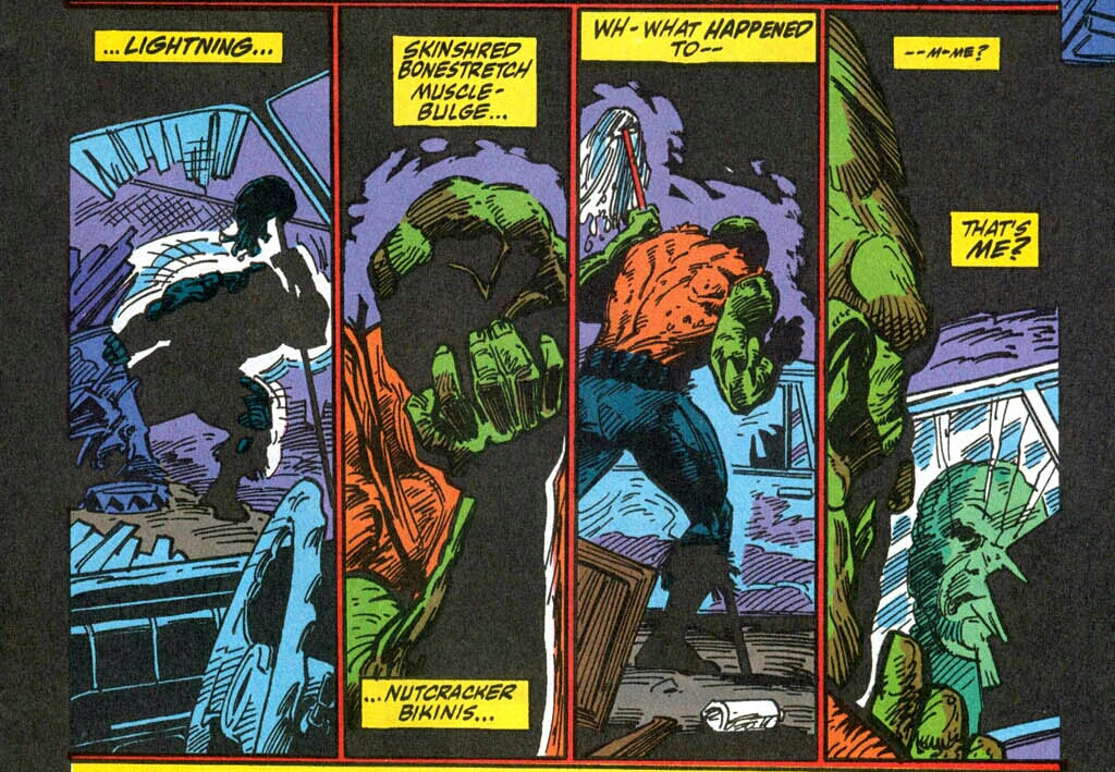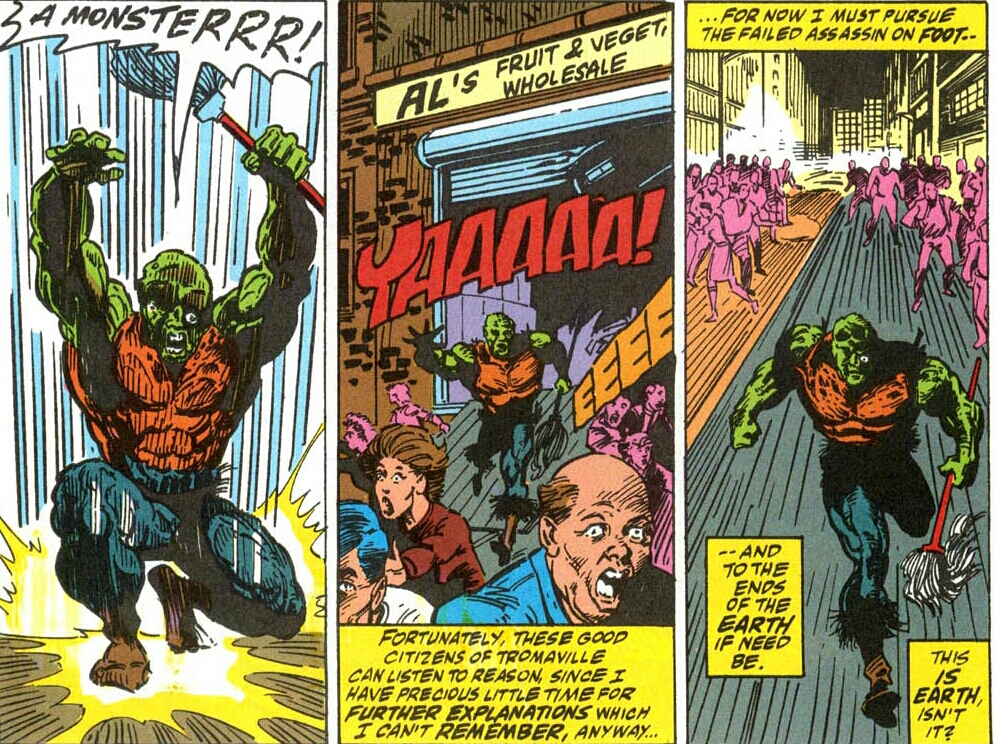 Poor Melvin did the only thing his embarrassed and horrified mind could think of. He ran away. Unfortunately for him, the amassed bulky bullies gave chase until Melvin jumped from the nearest window! The fall wasn’t too bad height-wise. It was what he landed in. A truck that was hauling toxic waste had stopped directly underneath that very window! A bolt of lightning then struck the very barrel he was inside! Moments later, the young man slowly tried to crawl from the industrial byproduct! His flesh burned and bubbled as he did so! His hair ignited and fell out as his muscles grew and swelled with each painful step! No-one tried to help. What could they possibly do even if thry had been that compassionate? The monstrous form that was once Melvin Junko then sought refuge in the only place he could, the garbage dump. (The flashback has now ended. I now return you to your regularly scheduled movie adaption comic, already in progress.)