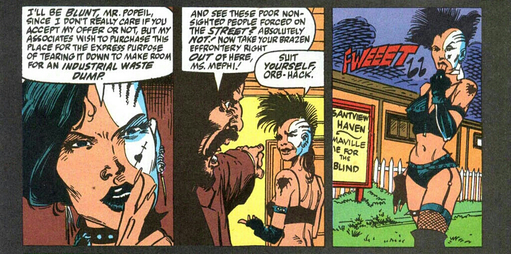 The punks round the corner and spy a humanoid form in the shadows. They waste no time in leaping from their hiding place and firing semi-automatic rounds into their intended prey! The three slowly approach their bullet-ridden target. It’s then that they realize that it was only a discarded mannequin. They question one another as to who cried out then. Their answer comes from a monstrous growl from behind them. The creature stands there revealed, spinning his mop like a weapon! (I totally did this move with a broom once. No lie! I mean, I quit after I nailed myself in the junk and went up a whole octave, but I did it!)