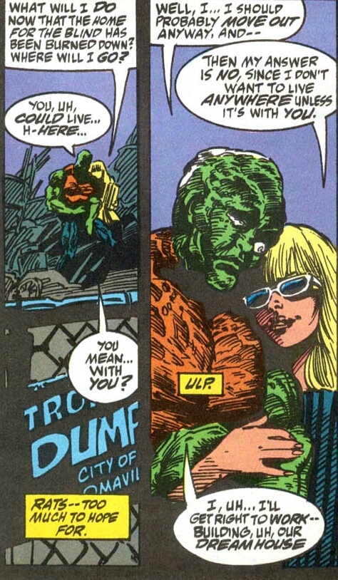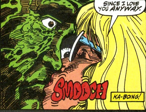 The two new lovers hold one another in the confines of their junkyard shack. Claire suddenly kisses her man. It’s then that he springs to his feet as his memories all suddenly flood in at once! His name is Melvin Junko! (Whew! Thank God! I was getting so sick of trying to find synonyms for the word “monster” and then alternating them! Though calling this huge guy “Melvin” isn’t much better!) Claire is understandably concerned. She asks Melvin if he’s okay. He replies that he is and that he now remembers how all of this happened to him. She begs that he tell her. He agrees and begins his tale.