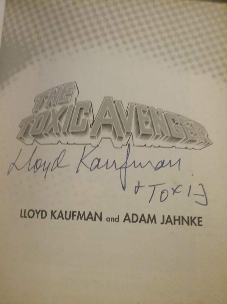 Some items that I, your humble Symbifan, possess: (A Toxic Avenger novel signed by his creator, Lloyd Kaufman, and a figure of Toxie that my son just presented me with tonight, bought with his very first paycheck.)