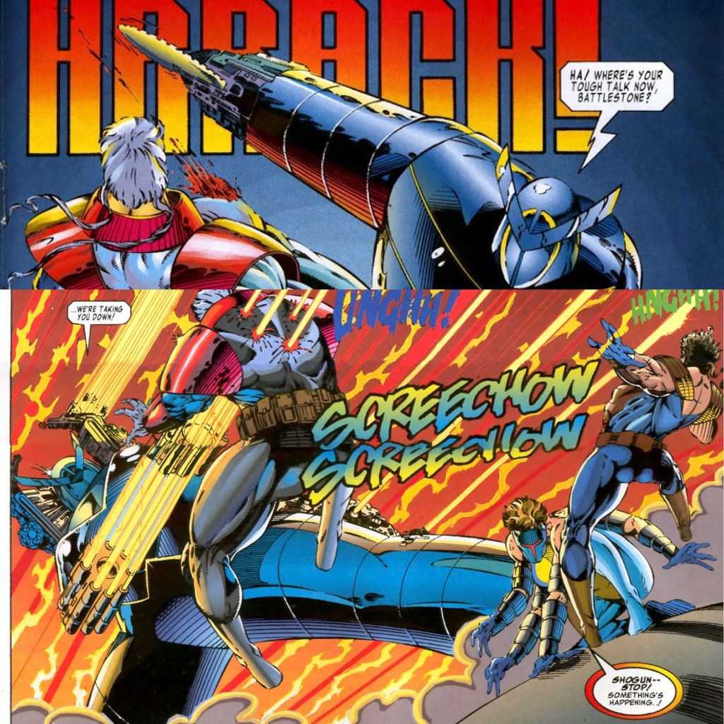 The rest of Bloodstrike (Shogun & Fourplay) manage to catch up to Brigade at G.A.T.E. International and engage two-on-two with Battlestone and Boone. I mean, it’s kind of weak compared to that last fight, but we do see Battlestone getting hacked with a buzzsaw and several holes blasted through his torso, which I feel is pretty sharp.