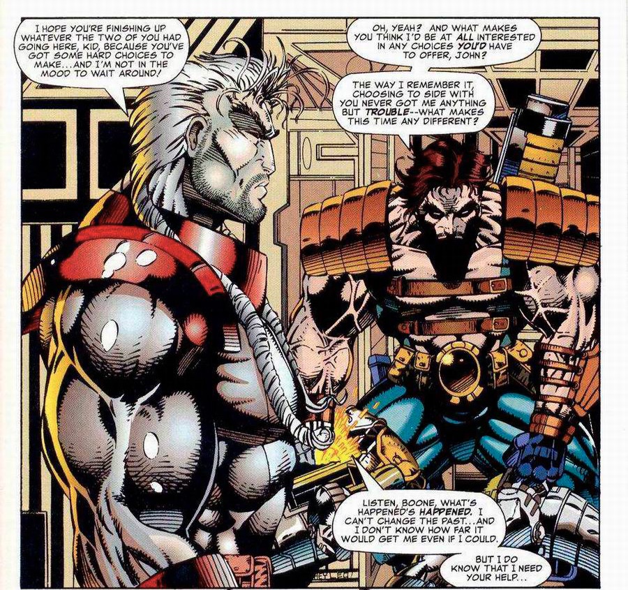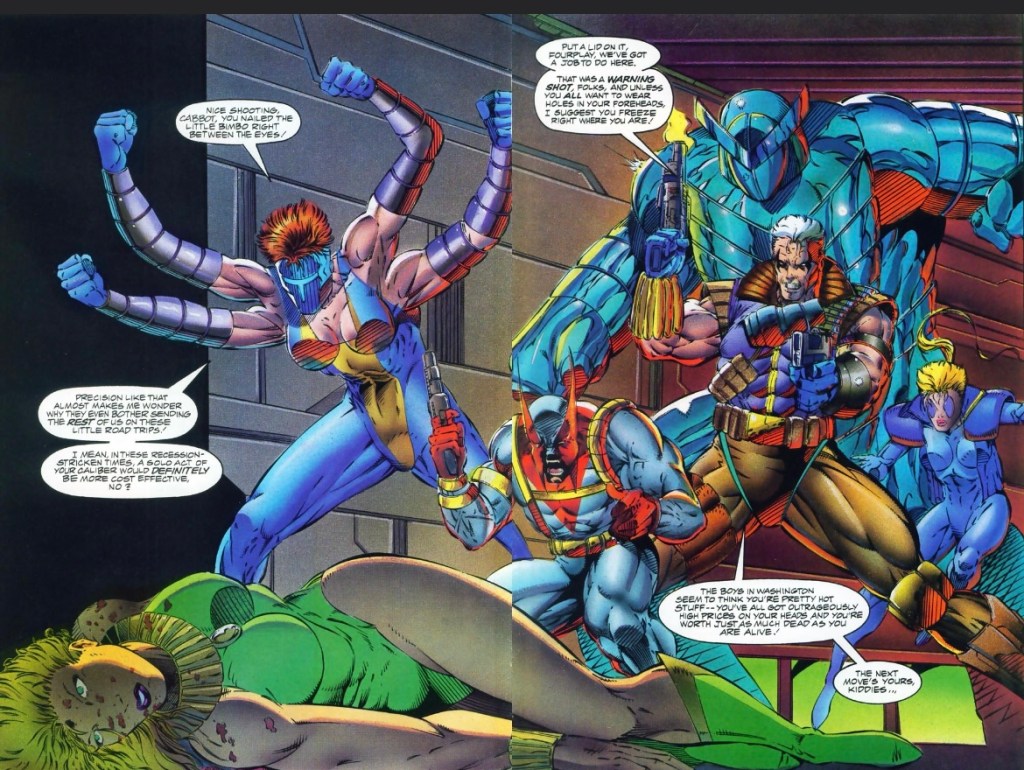 From that point it’s several pages of back-and-forth battle and tough guy (or girl) talk. Before Image, it was not that common to see giant battles that go on for several pages. Often a few panels here and there is all you got. Not when Rob Liefeld is charge. Strap in.