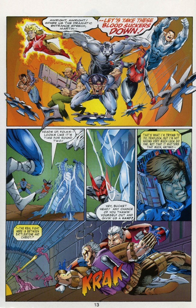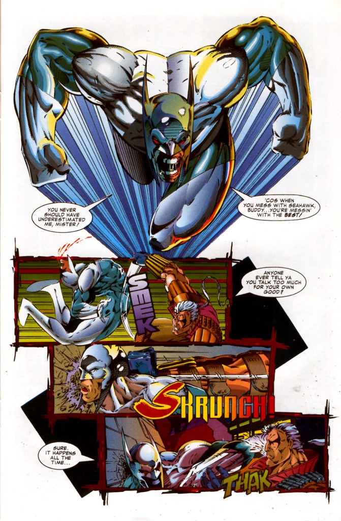 This particular issue probably has the least amount of action in the storyline, with a full five pages devoted to Lethal and Seahawk jabbering about Battlestone’s past and whatnot. During this exposition, Lethal refuses to tell much of her own story, but gives Seahawk the 411 on Battlestone and Bloodstrike. The lot of whom are alive and kicking due to their participation in Project: Born Again, a government program that revives dead soldiers. I’m getting bored, time for some more smashing.