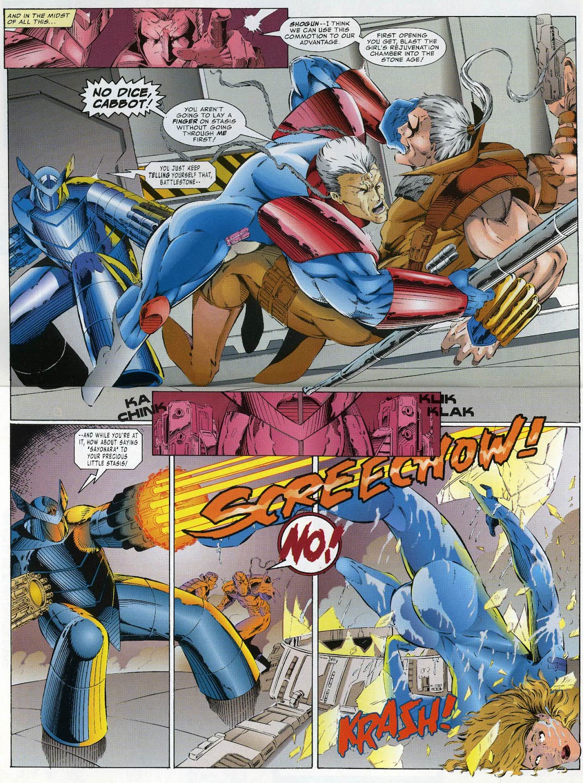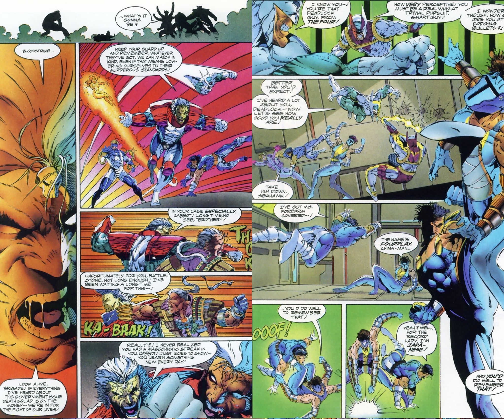 This particular issue probably has the least amount of action in the storyline, with a full five pages devoted to Lethal and Seahawk jabbering about Battlestone’s past and whatnot. During this exposition, Lethal refuses to tell much of her own story, but gives Seahawk the 411 on Battlestone and Bloodstrike. The lot of whom are alive and kicking due to their participation in Project: Born Again, a government program that revives dead soldiers. I’m getting bored, time for some more smashing.