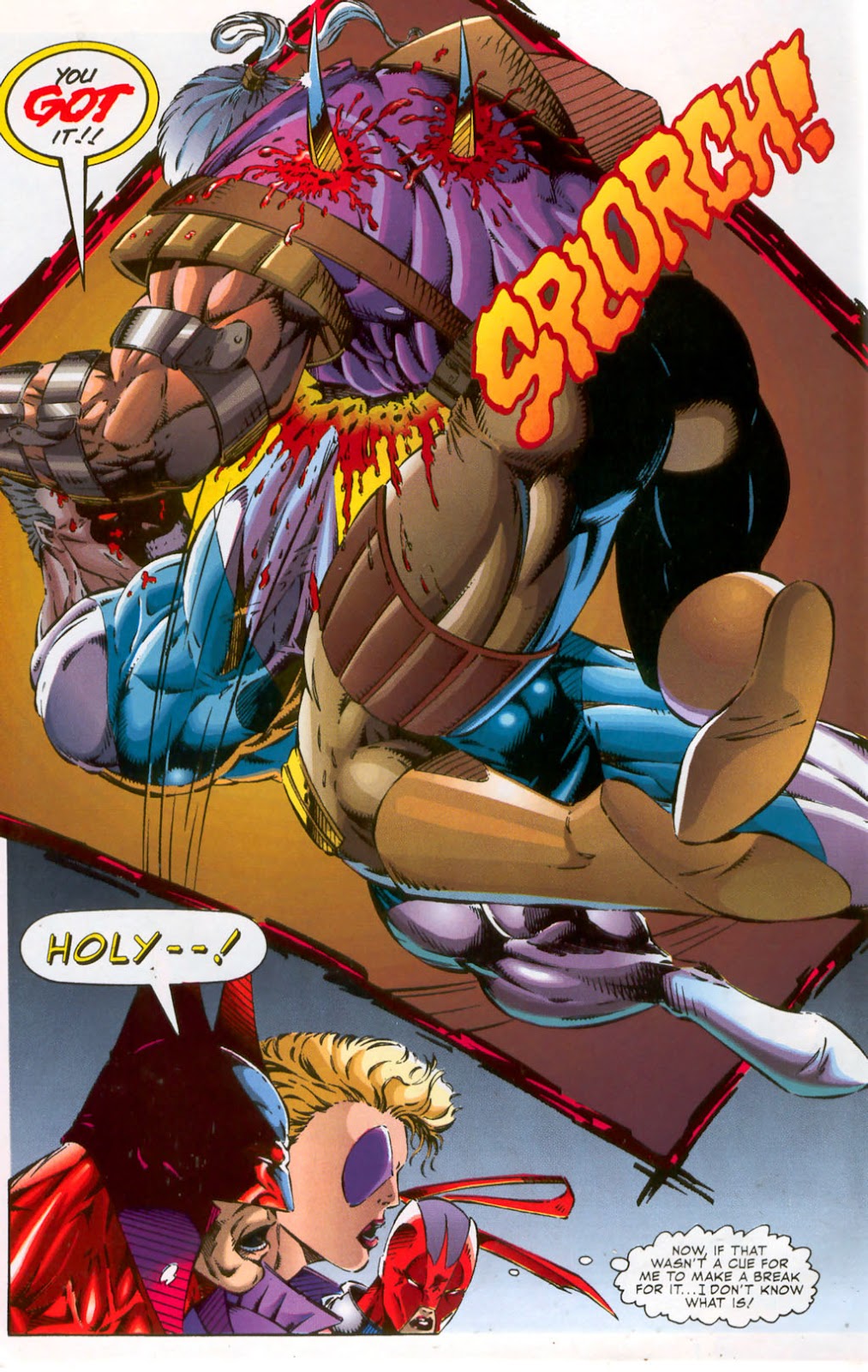 From that point it’s several pages of back-and-forth battle and tough guy (or girl) talk. Before Image, it was not that common to see giant battles that go on for several pages. Often a few panels here and there is all you got. Not when Rob Liefeld is charge. Strap in.