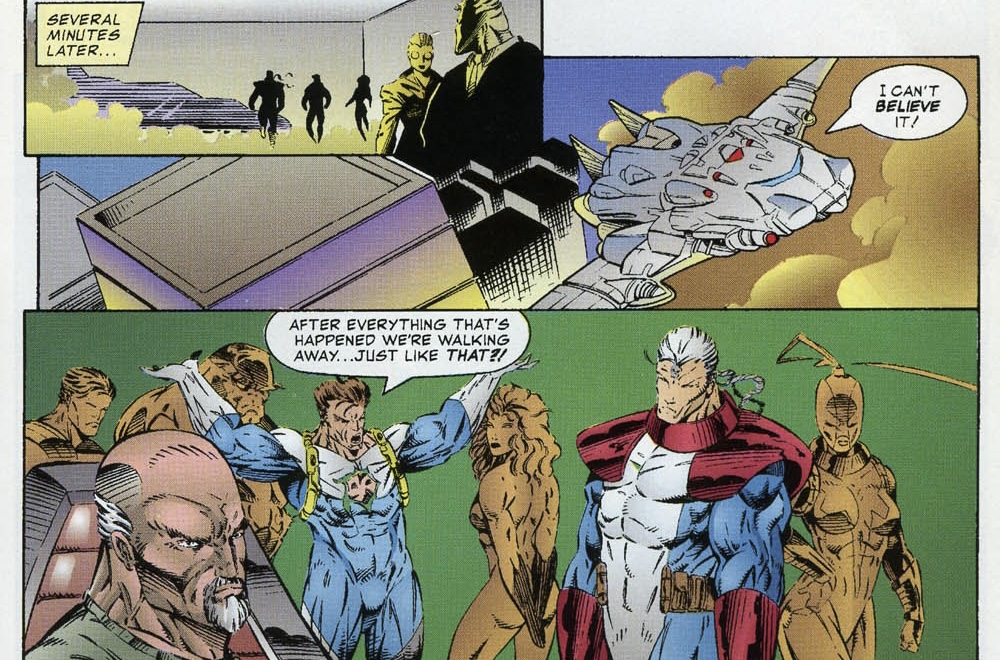 At one point in the fight, Coldsnap has his “regulation apparatus” damaged and seems to be getting consumed by ice. Seahawk is also taken down and it quickly becomes clear that Brigade is outmatched. Battlestone and Thermal recover Coldsnap and Stasis before high tailing it. Once in the air, Battlestone is back at his blowhard routine answering every query with the equivalent of “Shut up! I’m the leader!”