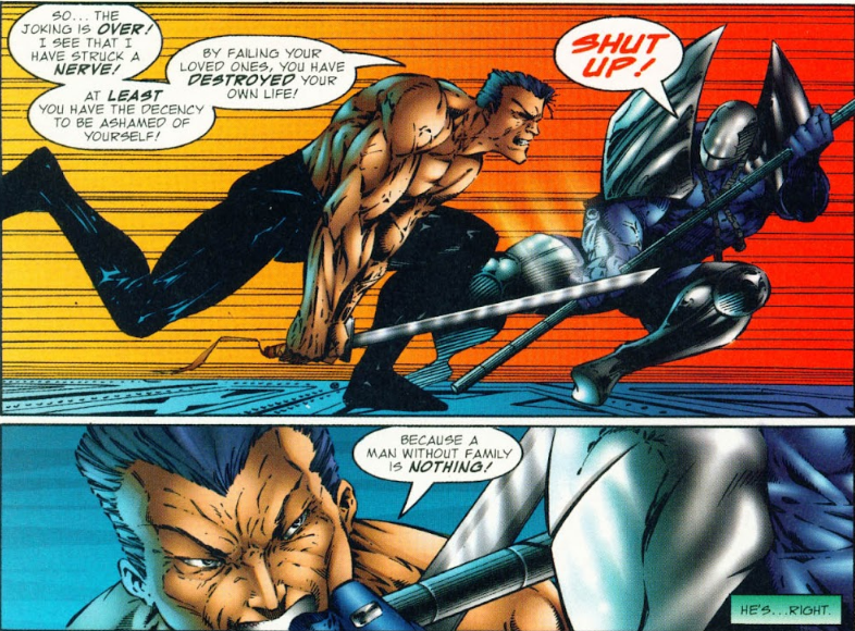 Let’s talk about the yakuza assassin, Kirasu. He’s not just the villain who arms the “nukes” during Carbone’s dockside arms deal; he’s also the one who gives Knightmare a significant beating. When Knightmare tracks him down, they have a brawl on a moving truck, but it doesn’t take long for Knightmare to end up almost gutted and thrown onto the road, watching as the vehicle speeds away with Kirasu standing triumphant on top.