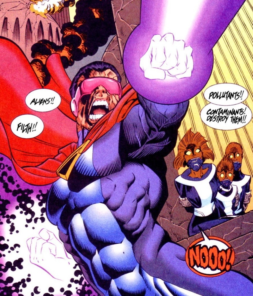 The scientist that had been examining him told Connor that they had somewhat isolated his problem within the core of his body. With a few months of research, she was confident that her and her colleagues could cure him. This angered David. Months?! He expressed his outrage verbally, but was stopped short when another attack hit his mind! He was in chains. A man stood over him, yelling at him about the purity of Krypton and how he and these other alien beings deserved their fate! The man then fired a device at the creatures, disintegrating them completely! David cried out in outrage, and energy flowed through his body! As he powered up on this alien world, he was in actuality doing so in the lab on Earth! The scientists fled for their very lives! But the Eradicator saw none of this. To him, he was facing a sadistic killer in front of him! (Oh yeah. Me thinks the Eradicator needs some of the fantastic pills that I take for delusions. At least he’d be too sleepy to freak out and accidentally hurt people. I know it helps me when I feel the need to power up with godlike energy in anger. Hmmm. Maybe I should up my dosage…..)