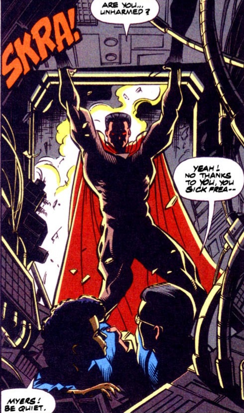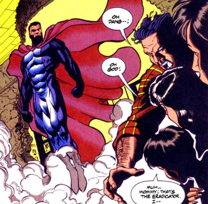 As the Eradicator awaited further tests upon his being, he thought back. He was once a scientist named David Connor. After the Eradicator had been seemingly fatally wounded in the battle against the Cyborg Superman, his complex body was delivered to him for further examination. Connor became obsessed with discovering just how the Kryptonian killing machine ticked. After all, throwing himself into his work took his mind off of his failing marriage and the cancer slowly killing him. That was before the accident. A power surge caused a large explosion in the lab and David’s mind was somehow combined with the powerful body of the Eradicator! His sickly corpse was left behind, forcing others to assume that David Connor was dead. As the new Eradicator, he became an anti-hero. Heroic, but lethal all at the same time. He finally felt right. Like this was his fate. But now it seemed as if something was wrong with his new body as well. (Are we all caught up now, kiddies? Good. Don’t feel too bad about Doctor Connor. He had two sons that he let believe he was dead so he could be a superhero with no attachments. Yep. A total ass…..Damn, he was cool!)