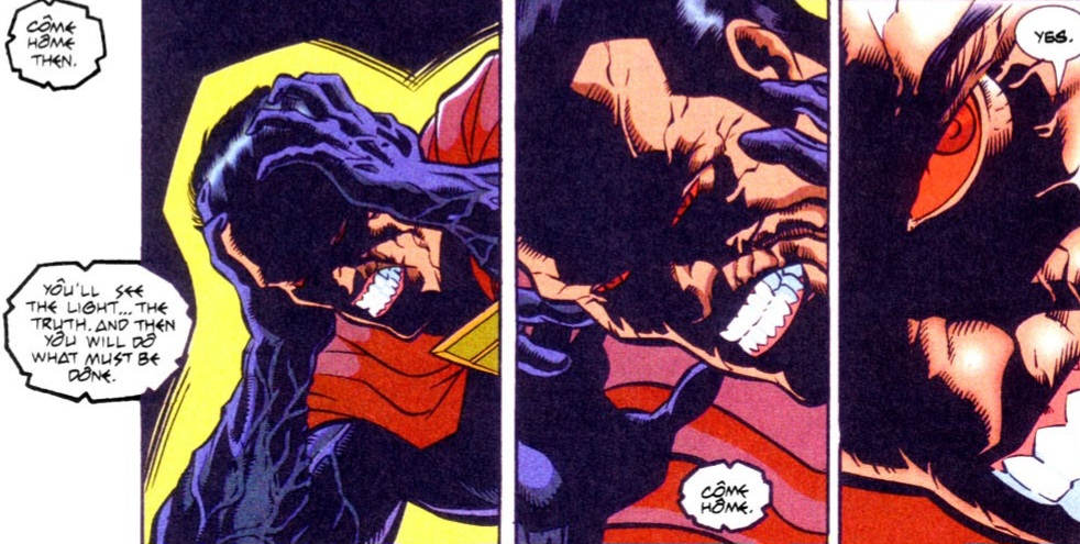 The man then does the unthinkable. He actually moves to attack the Eradicator! But as he does so, he yells in outrage about how this monster before him murdered David and he won’t let him hurt his sister and nephews! The Eradicator is stunned. This man is Maria’s brother? David doesn’t remember him at all. Shouldn’t he? Before he can think about his actions, he fires his heat vision to protect himself. He doesn’t hurt anyone, but Maria immediately moves in to protect her children. Connor speaks then about their failed marriage in anger. This not only confuses the woman, but angers her enough to slap the Eradicator! He’s not David! David is dead! The smallest of the two boys runs to him then, clutching his leg. Is he really his father? David begins to answer that yes he is, but he stops himself. Instead he doubles over, clutching his head! (Someone call a Kryptonian exorcist! We’ve gotta live one here!) An inner voice pushes him to kill! He denies it with every fiber of his being! The voice then whispers for him to come home. David whispers one word in response, yes.