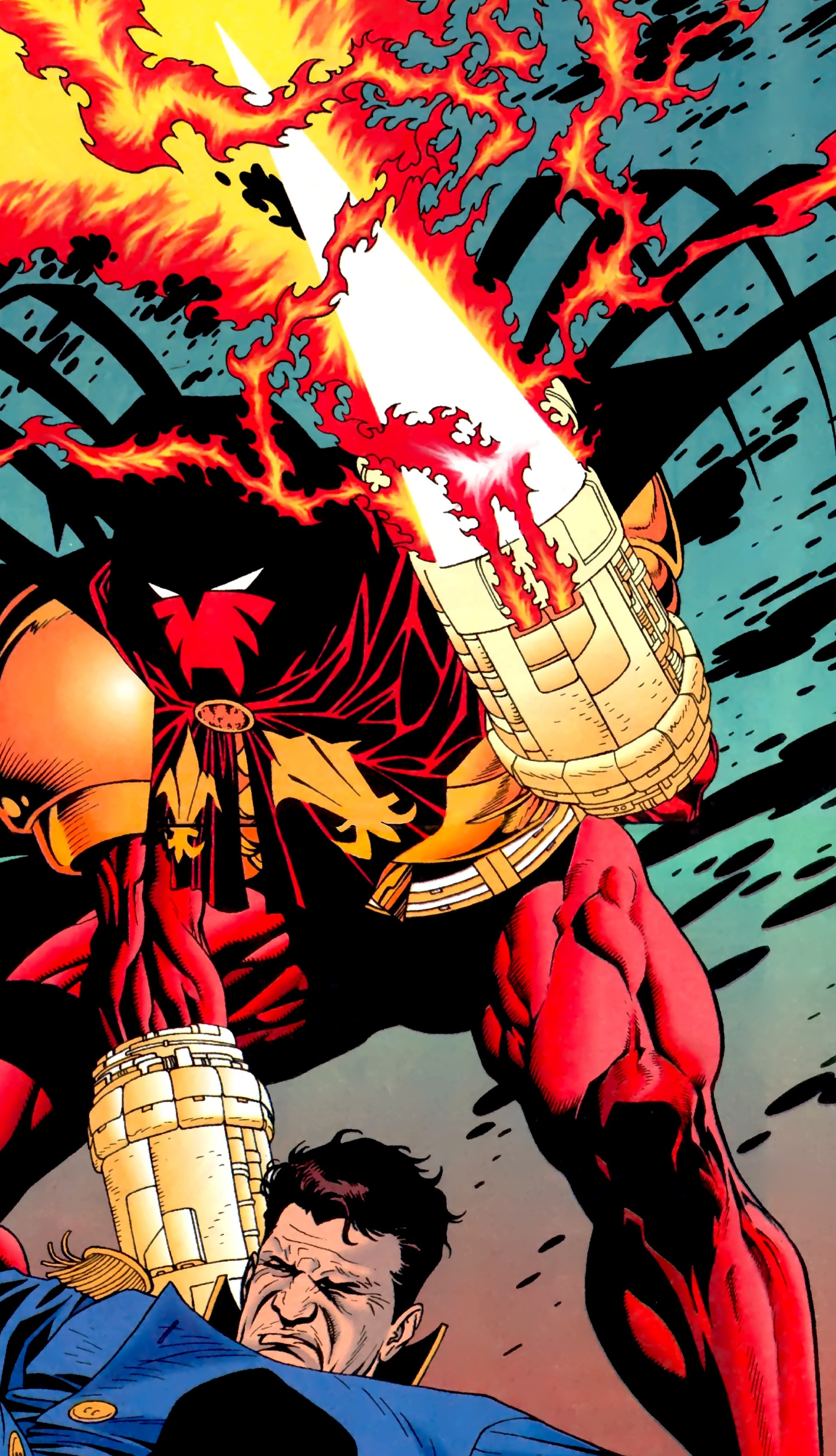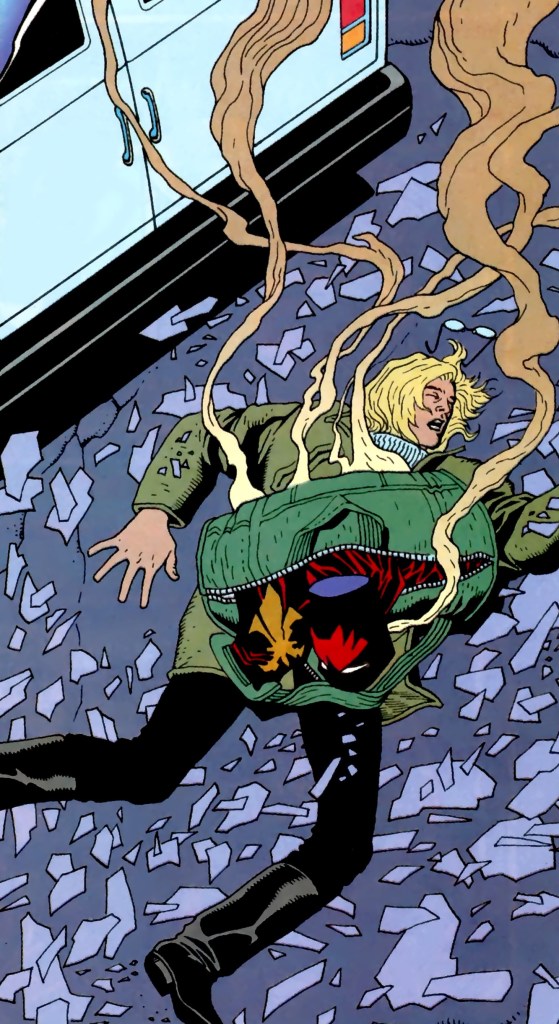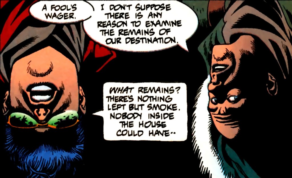 Azrael’s limp form hit an ambulance parked below and then rolled onto the street! At that precise moment, Bruce Wayne and Alfred’s vehicle comes to a screeching halt nearby. Having witnessed the horrendous scene, they exit the car and Alfred checks the young man’s vitals. Surprisingly, he lives! Bruce tells his butler/friend to watch over him while he leaps into the broken window and investigates. Strangely, Bruce enters the room as himself, not Batman. (Real smart move there, Brucie! Why not just flash the bad guy your Justice League ID card and Batman undies while you’re at it! Dumbass!) Bruce witnesses LeHah in costume with a large rifle aimed at a dwarven male on the floor! But the weapon jams! Taking this as a sign from his demonic lord, he flees the room. Wayne pursues the madman against the complaining dwarf’s grumblings and comes to a halt inside a hospital storage room. Scanning the small space quickly, he’s a fraction of a second too slow as LeHah drops a chemical contained within a beaker upon the floor. It shatters! Strange smoke fills the air before the room explodes!