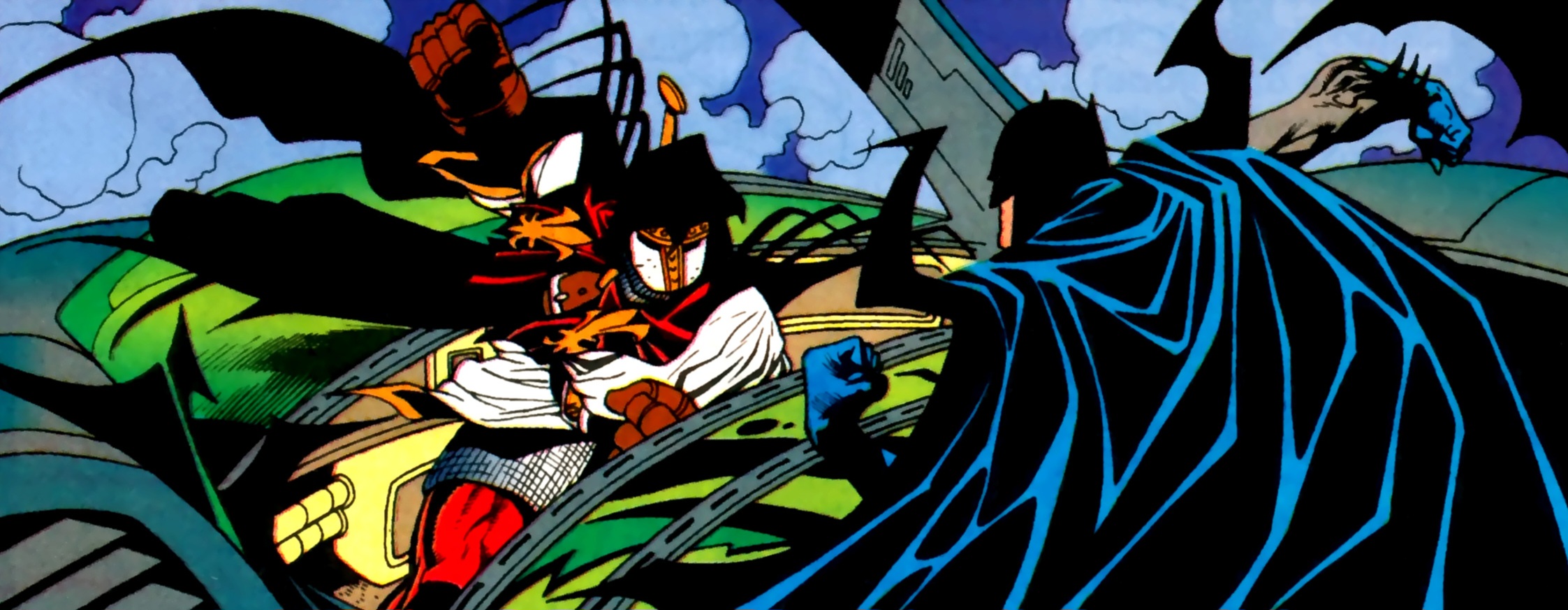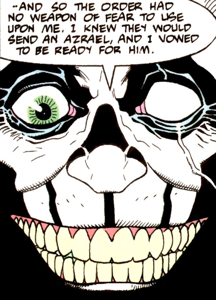 Needless to say, even after hours of questioning under the powerful drug, Batman gives no information. LeHah is beside himself with anger. He raises his weapon to Wayne’s throat, but the Dark Knight merely smiles. Back to Azrael and his allies, Nomoz complains that they have no idea where LeHah will strike next. Alfred suggests a bit of detective work. Azrael looks at the facts and discovers that the madman is striking in a straight line acrossEurope. England would be the next likely target should any members reside there. Nomoz states that there is. Alfred tells them that his employer would now choose a direct attack at his foe. It is agreed. Later, LeHah does in fact strike next in London. As he gains access to the unsuspecting member’s home once again without hesitation, he walks behind his elderly prey. He slides out his dagger and, strangely enough, pulls Batman’s mask over his face, readying himself for a strike! (He’s wearing Batman’s mask now?! This guy’s so crazy, he’s actually trick-or-treating before he kills his enemies!) Outside, a car pulls up to the outside gate. A guard moves to question the occupants. As Alfred rolls down his window, Azrael strikes quickly from behind! The final confrontation is soon at hand.