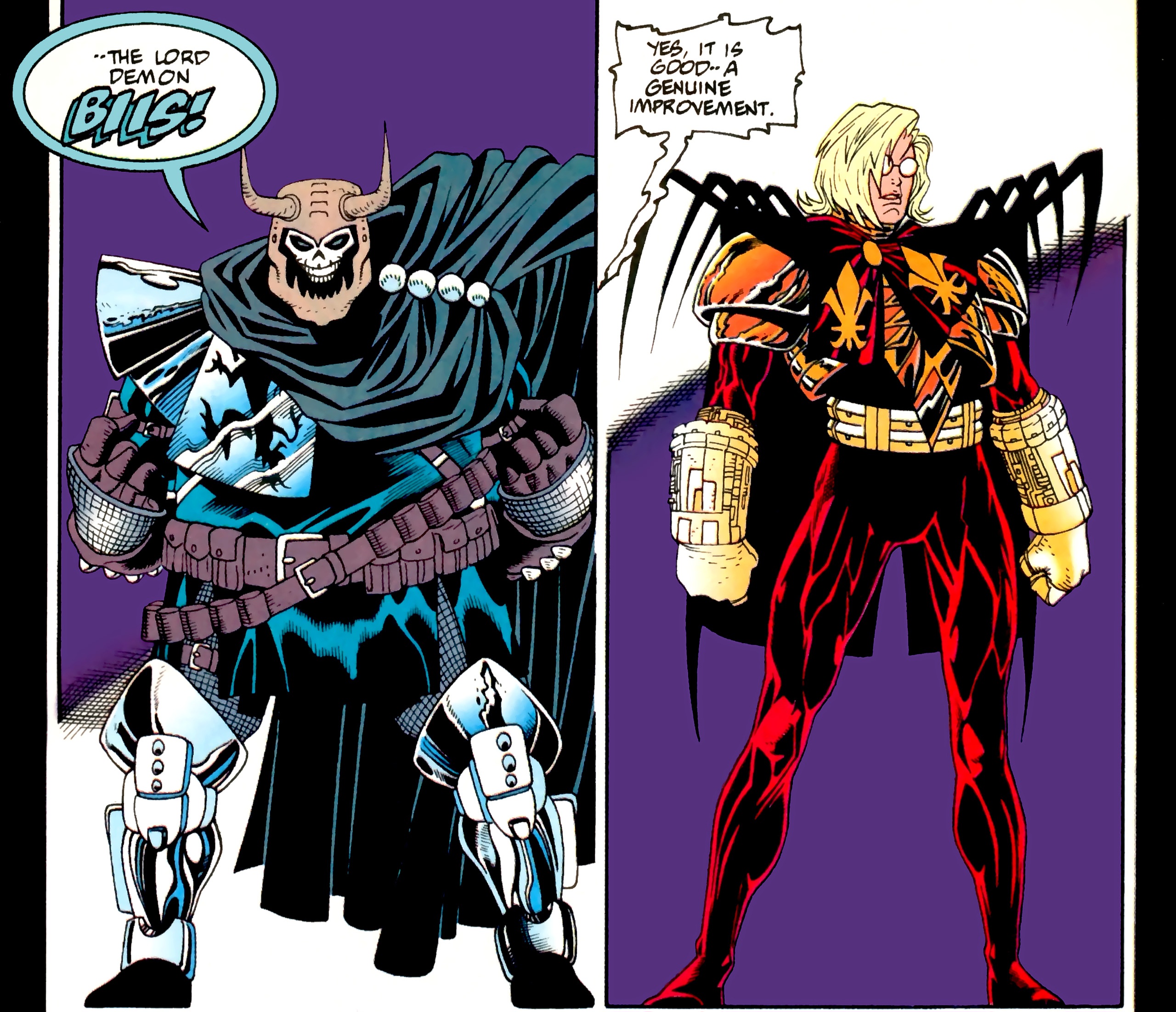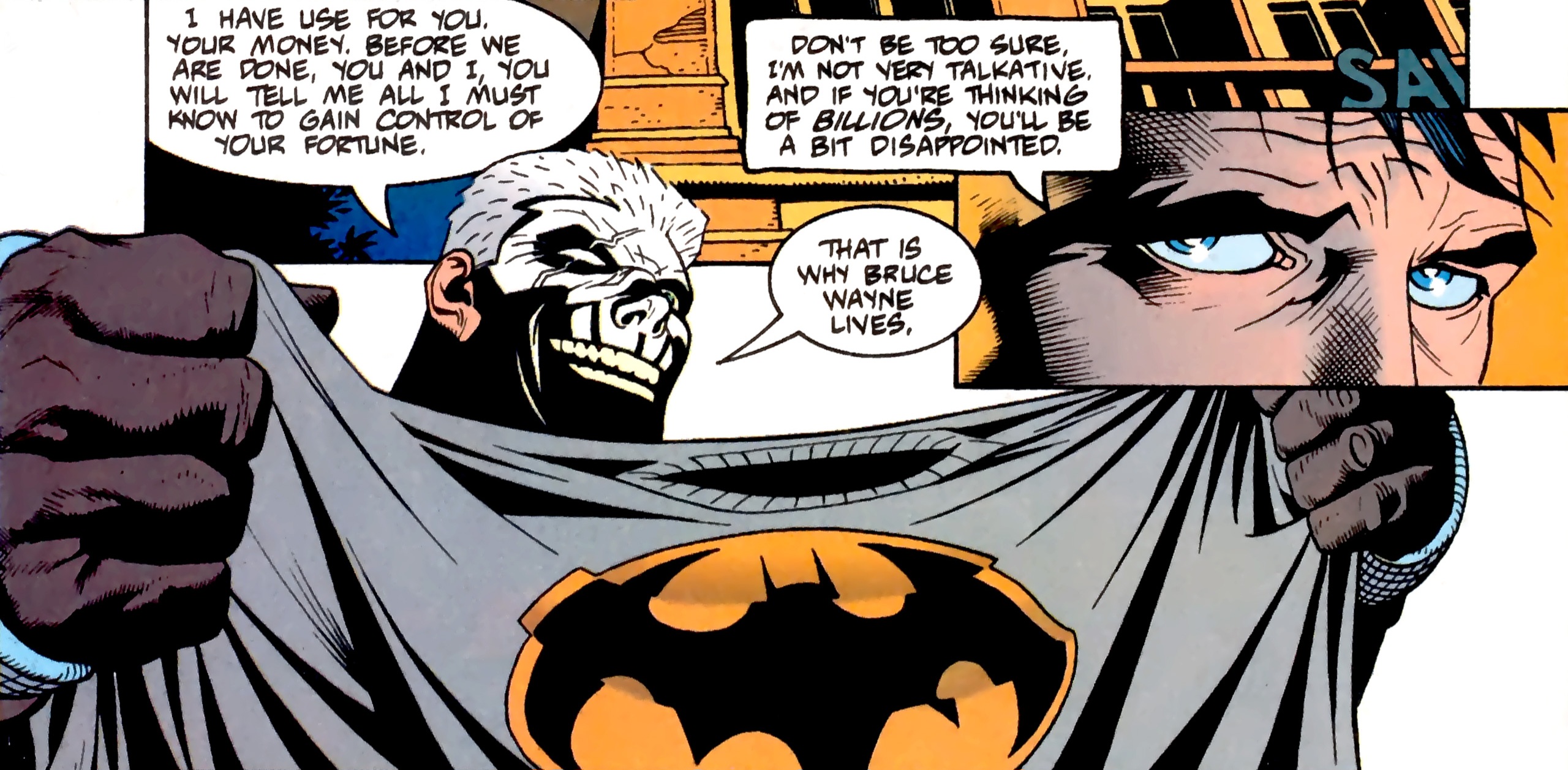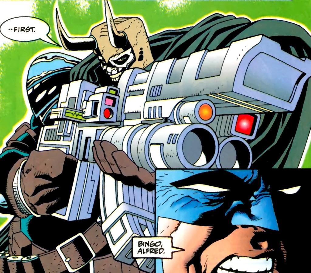 Meanwhile, Nomoz holds a blade to Alfred’s throat as he drives. The dwarf warns the butler to keep driving as Azrael lies unconscious in the backseat. Alfred replies that the young man should be taken to a hospital rather than wherever he was being forced to drive. This idea is refused. Alfred then suggests lowering the weapon. After all, with Bruce now captured, he needs their help as much as the dwarf needs his. Nomoz doesn’t reply. Instead, they pull over near a secluded house and carry the Avenging Angel inside. By now, Azrael has awakened enough to sit. Alfred remarks how quickly the youth has recovered from what seemed to be fatal injuries. Azrael replies that the armor contained within his duffle bag took the brunt of the impact from the bullets. Elsewhere, the crazed LeHah has discovered that his captive is not only the millionaire, Bruce Wayne, but the Batman as well! (Yeah. Way to go there, Bats. Gee, who could have forseen this development from years of loyal comic book reading? Oh yes, me! Point goes to Symbifan. ) Bruce asks why he’s still breathing. LeHah answers that he wants the Wayne fortune and will keep him alive just long enough to get it.