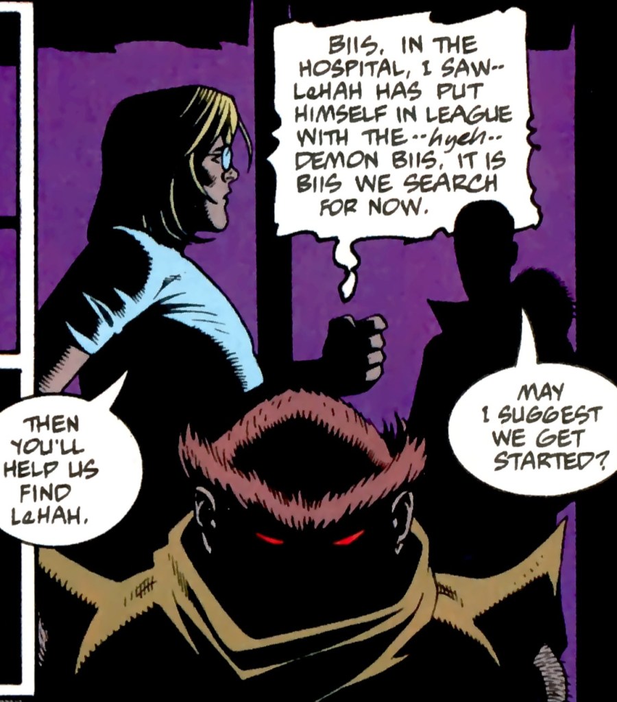 Bruce Wayne rises, coated in ash and chemicals! Hallucinating and injured, he scowls at his prey! But instead of a strangely-garbed man, he sees a demon in front of him. Regardless, he attacks the “creature”! Batman strikes at his foe several times, but his attacks are clumsy and uncoordinated. LeHah parries every strike before surprisingly defeating the Dark Knight! LeHah then drags Bruce from the hospital exit and into the back of the running aforementioned ambulance. He is stopped by a shocked guard for a moment, (Not as shocked as he should be by seeing the secret, demonic member of the Village People in my opinion!) but the larger man kills him with ease before entering the emergency vehicle and peeling out! But too late! Batman has regained consciousness by this time and leaps to freedom! He rolls to a stop next to Alfred in the alleyway. Alfred barely has a moment to look over his employer before the ambulance screeches to a halt! LeHah exits. He walks over and strikes Alfred, nearly knocking him out! He picks Bruce up again and places him back in the vehicle. He then drives away without a word.