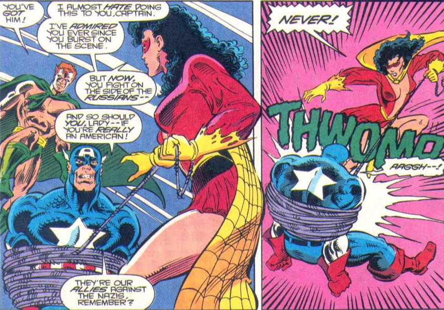 Captain America meets his sparring partner first. But the enemy, the Human Meteor, leaps over this attack as the woman behind him, the Spider Queen, fires webbing from her wrists, entangling the star-spangled hero so that he falls over, unable to snap this cocoon! The Spider Queen admits aloud that she hates to attack him, but she won’t side with those that stand with Russians. Cap replies that the Russians are our allies in this bloody war. She should stand by them as he does. This comment enrages her and she kicks him in the stomach, knocking the wind out of him! Meanwhile, Namor strikes at his assailant, Strong Man he calls himself. But the large man is way to strong, even for the Avenging Son of Atlantis! He strikes again and again with powerful punches! The Human Meteor tries to help, but Strong Man orders him back! He’s been bullied all of his life and the Prince of Atlantis is his and his alone! (Man, these guys are real pros! They even have the time to introduce themselves in the midst of fierce hand-to-hand combat! Impressive!)