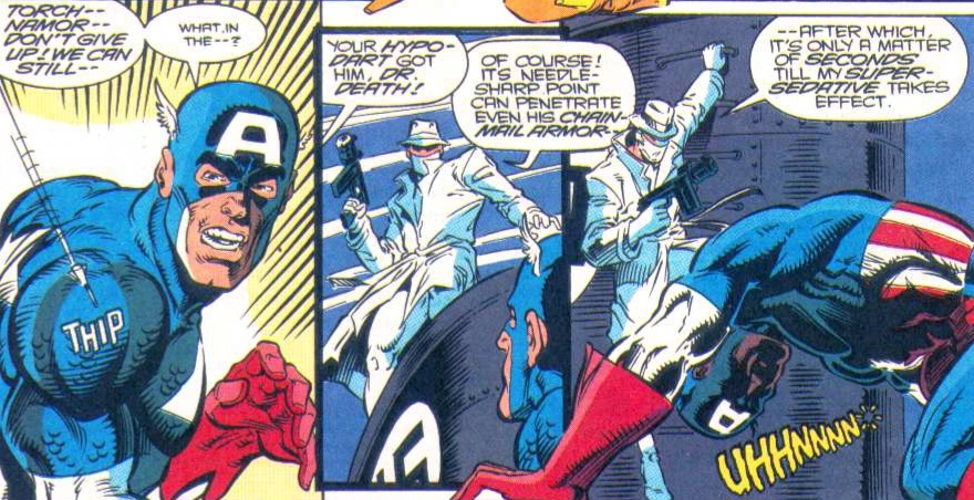 At this moment the Human Torch battles his opponent, Volton, to no avail! His fireballs seem to do very little and while he’s in the midst of throwing more, Volton suddenly encircles the Torch in an aura of electricity, frying him slowly! Never to be beaten by Nazi scum, Captain America uses all of his superior strength to pull out of the webs and slaps the Spider Queen unconscious with a tap! (Lol! Heaven forbid we strike a female Nazi with a closed hand! She might get her widdle evil feewings hurt.) But while Cap’s attention is on this, the last villain, Dr. Death, fires a tranquilizer dart strong enough to penetrate the Invaders leader’s chainmail and knock him unconscious with the toxin within! But just as the supervillains are arguing about how to murder their foes, the Atlantean ship comes from nowhere and hits the Nazi boat! The force knocks the severely injured Invaders into the ocean! The members of Battle-Axis decide to leave in the damaged U-boat. They’ve proven their point. But water is the realm of Namor and he quickly awakens due to the liquid’s healing properties upon his hybrid flesh. He quickly pulls his comrades ashore.