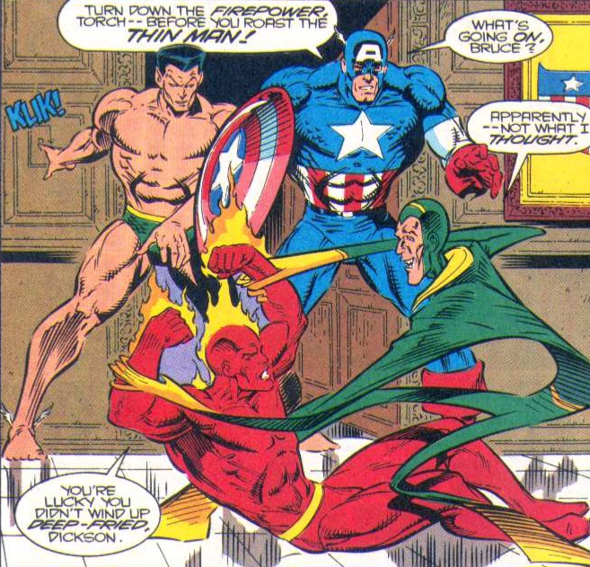The Invaders make it to the docks where they’re helped ashore by concerned citizens with warm towels for the heroes. But there’s never time to rest in this war. After a brief thanks, the three take off into the air while the dock workers look on in disbelief. They fly to the roof of Times Tower where the Torch puts Cap down and then descends himself. Namor follows suit. They enter the building with the Human Torch lighting the way in the darkness. But in this darkness, a figure suddenly attacks the Torch, knocking the artificial man to the ground! But before he can retaliate, Captain America stops him. The attacker is none other than the Thin Man, stretchy hero of the Liberty Legion! Thin Man apologizes as he thought they were Nazi saboteurs. Cap briefly asks of the whereabouts of the other Legionnaires until he’s satisfied that everyone’s safe. Thin Man asks what brings the famous Invaders from their headquarters in London. The trio speak of investigating news of Nazi planning attacks in the States. That’s when they bring up their superpowered attackers. The Thin Man seems to know who they’re speaking of immediately. (Now I’ve seen stretchy superheroes in comics most of my life, but the Thin Man creeps me out! He’s like a roadside accident. You don’t want to look, but…..) He pulls out files and files on superpowered people from America that have suddenly switched sides! The members of Battle-Axis are in those files!
