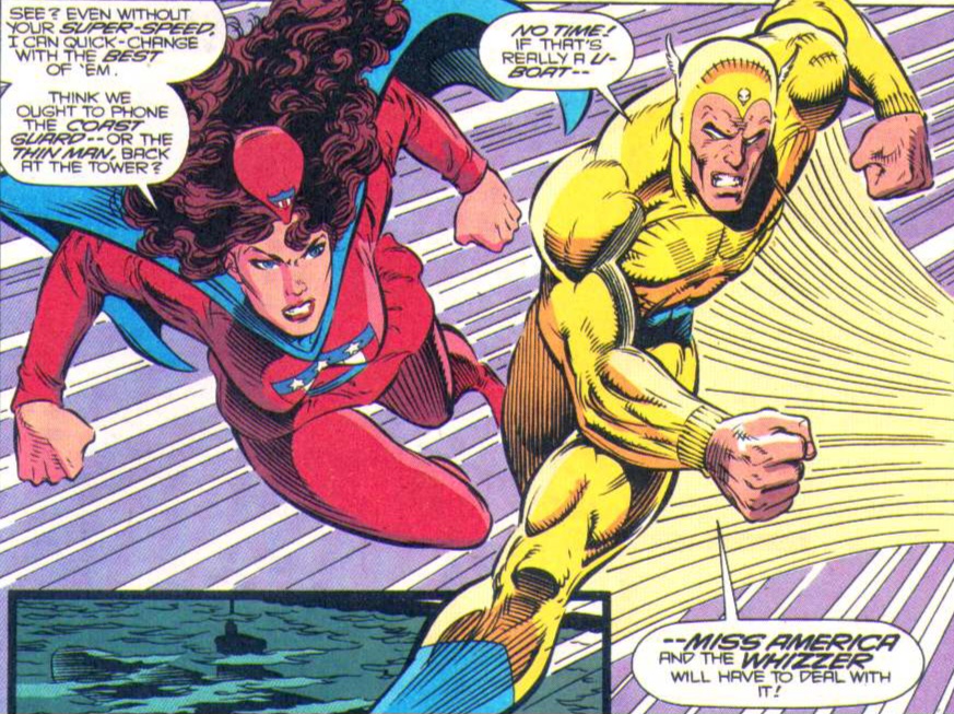 At this precise moment, a loving couple walks through a beautiful park on Manhattan’s east side. They speak of new love and silly, past squabbles until they suddenly kiss. But as they share this romantic moment, the woman notices a shimmer of something metallic out in the water. Both look more intently and recognize the form of a submarine below the water! That’s when the two burst into action, quickly changing into costume! Within moments, Miss America and the Whizzer race into action! (Yeah, I know. He’s called “The Whizzer” and he wears a yellow costume. Grow up, you guys! Heehee. Might as well call him “Pee-Man”.) The two superheroes debate what would bring a sub this close inland. This conversation allows them to be blindsided by the quick fists of Battle-Axis’ Human Meteor and for Miss America to be ensnared by the Spider Queen’s webs! Both heroes seem to be battered unconscious at this point! The villains speak of their scheme to now travel to the Mojave Desert for the next part of their plan as they begin to tie up their prey more securely. But Miss America suddenly breaks free of her bindings! She realizes she can’t rescue the Whizzer as well as escape! She must leave him behind to go get help! The Human Meteor and Volton spring into action, giving chase!