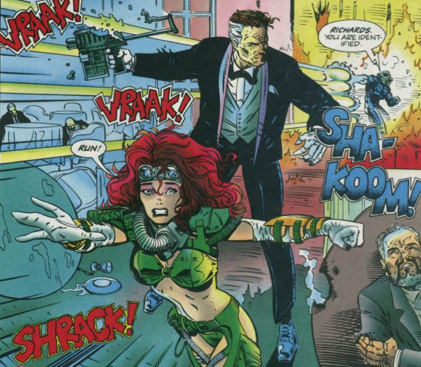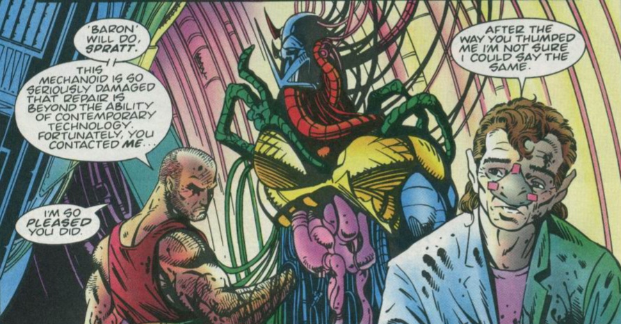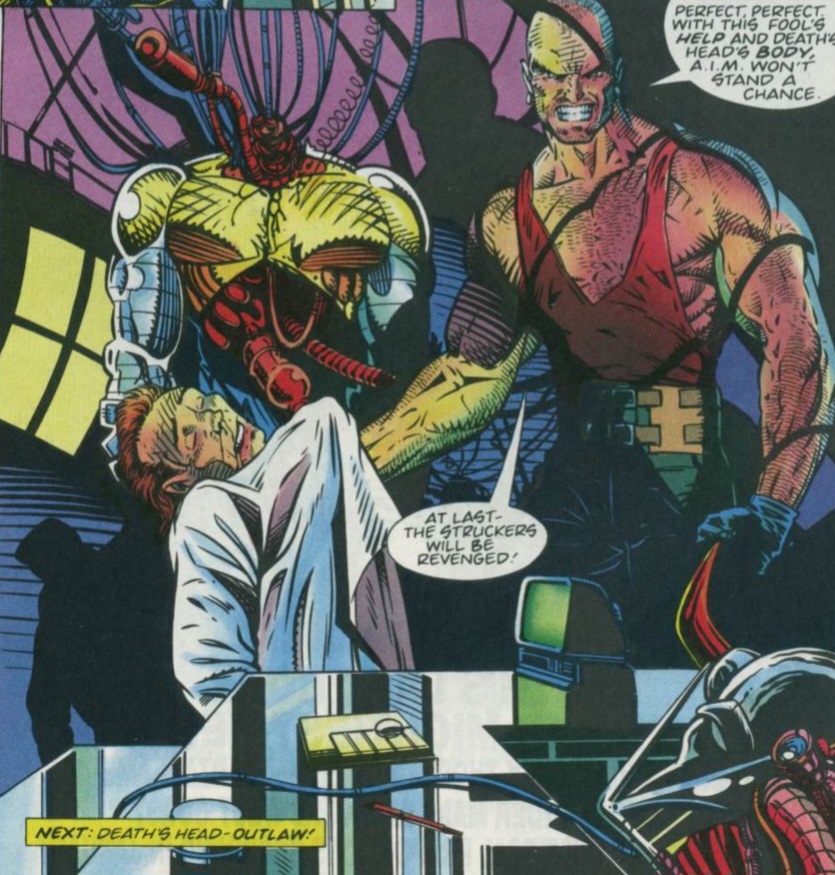 But as she finishes this sentence, she is stopped from continuing by the sword pressed to her throat! Death’s Head approaches Necker, amused. He introduces Tuck as the young lady lowers her weapon. The cyborg then tells the doctor that, as he’s now his own man, he won’t be returning. Inspiration suddenly hits Dr. Necker. She begins to negotiate a price for his aid instead. Taking the bait easily, he negotiates back until a large sum of money is agreed upon. Tuck refuses to leave his side and so is added to the deal as a new partner of sorts to the cyborg. The trio teleport back through time together. (Two sexy redheads for the price of one? Must be awesome to be a hideous cyborg monstrosity, huh?) In 2020, the Baron speaks of how his grandfather created A.I.M. during the second World War only to have his creation turn its back on him. Now, he will have revenge for his entire family line. Spratt quakes with fear as the Baron turns, revealing his new hideous image! He then murders the fleeing sidekick as he proclaims himself now to be called Charnel! (I know I’m supposed to be repulsed, but how sweet does this guy look?!) Death’s Head and the two ladies appear a short time later. What they witness at the 2020 A.I.M. headquarters, is the stuff of nightmares! Necker had seen something like this once before. Using magic and technology together, someone was attempting to un-create A.I.M., stopping the birth of the Minion cyborg as a result!