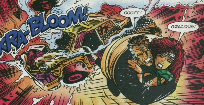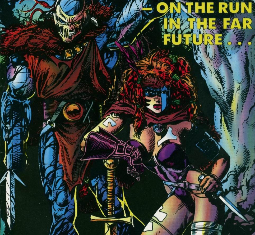 (I’m gonna have nightmares! Badass nuns armed with weapons? Isn’t that every man’s deepest, darkest fear? Shudder.) Now the battle truly begins! It’s during this madness, that one of the nuns raises her crossbow, aiming at the Hood’s head! Unaware, he continues fighting others in the caravan party! But before she can fire a shot, she’s run through from behind by a young red-headed woman in blue warpaint! The battle ends soon after. As prisoners are taken and loot is collected, the woman introduces herself as Tuck and she wishes to join the Hood’s group. The Hood asks why. Tuck doesn’t mince words. This planet is corrupt and only this band of outlaws seem to be fighting back against the oppression. The Hood replies that every one of his men is a cyborg and therefore their very existence is illegal by the planet-wide ban on technology. Himself included. His name is actually Death’s Head and he hails from the year 2020. Tuck then surprises the cyborg as she admits that she herself is a completely synthetic being! Death’s Head pauses. He then orders Tuck to grab some loot and follow the others.