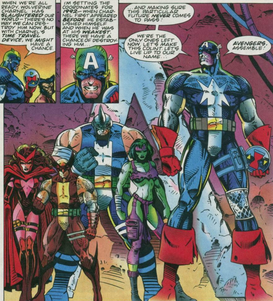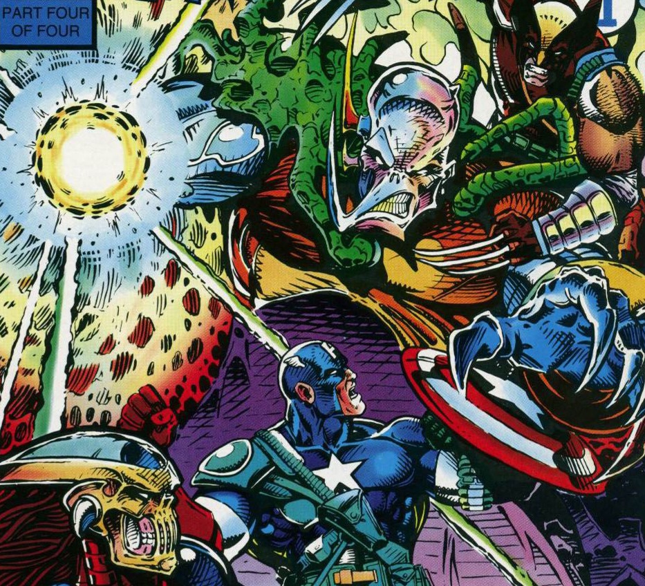 Rhino came to stand with his arm around She-Hulk. The others surrounding the meeting table were the Scarlet Witch, Captain America, and an orb that held a fleshy blob that was once the leader of the Fantastic Four, Mr. Fantastic. That was before Charnel punished the scientist with his dark sorcery! Wolverine came to a halt to stand by the others as the meeting began. The plan was a simple one as plans went. The disc was a time travel device. Using it, some of them would travel to 1992, the time that Charnel was born, and end him. If all went well, this nightmarish time period would cease to exist! Mr. Fantastic wished the superheroes his best as the battle cry was given, “Avengers, assemble.” And with those rousing words, (Much better than “MmmBop.”) the group teleported backwards through time! Meanwhile, in 1992, Death’s Head stood with Dr. Evelyn Necker and Tuck as they scanned their surroundings. Once, this was a busy shopping mall. That was before a mysterious fire burned it to the ground and A.I.M. purchased the land dirt cheap. They were currently looking for the creature that had already converted one A.I.M. headquarters into a place of literal nightmares. But before they could get much of a feel for the barren area, Death’s Head was suddenly jumped from behind by the Wolverine of 2020! The mutant sliced through the cyborg’s back and out of his stomach area with his razor-sharp, unbreakable claws!