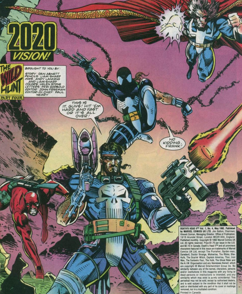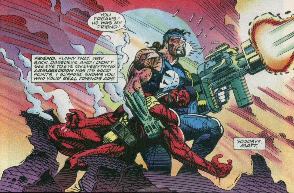 It is the year 2020 AD and the world is a war-torn, desolate place. Only a very small group of freedom fighters stand in the path of the one who corrupted this planet to the state it’s currently in. The Punisher leads the charge with Daredevil, Spider-Man and Doctor Strange following. In the past, this unlikely team would be more than enough to best any evil foe. Now? The odds don’t look very good. Charnel’s demonic drones surrounded the heroes! But twenty years of constant fighting had taught them how to hit back even harder. Back-to-back, the heroes fired at the creatures. The fight was going well until Spider-Man’s spider-sense went wild, warning him of danger! The evil warlord, Charnel, now stood before them! The monster began by taunting the heroes. But this meant nothing to the Sorcerer Supreme as he hit the creature with magic blast after blast! Charnel laughed as he used his own magic power to meet this mighty attack! Daredevil orders Spider-Man to swing off, following their plan! The wall-crawler does so with zero hesitation! That’s when a an energy blast of epic proportions hit the ground surrounding them! The Punisher turned to see his once-rival, Daredevil, drop and breathe no more! (Damn! Bleak much? Let’s stop here to sing a rousing battle song for our brave, fighting heroes. Who knows the words to Hansen’s “MmmBop”? Don’t lie.)