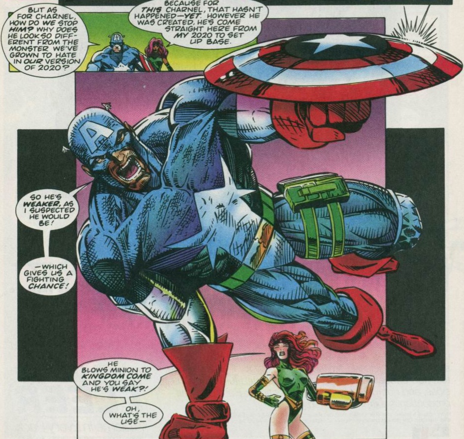 Wolverine leaped into Charnel’s waiting, clawed hands, slashing wildly as Captain America threw his iconic shield! The weapon cut off the villain’s arm, forcing him to drop Wolverine! Death’s Head then reemerged on the battlefield and joined Wolverine and Captain America in their brutal fight! Rhino shook what remained of the cobwebs from his head and charged Charnel once again! That’s when Tuck noticed someone else trying to stand in the rubble! Dodging the fight, she found the very much alive form of the Scarlet Witch! Tuck helped her stand as she hit the madman with everything she had! But big mistake! Charnel absorbed her strange, magical energies and merged them with his own!He then unleashed a wave of power that incinerated Cap, Logan, and Rhino as he grew to the size of a true titan! As the beast cackled, Death’s Head whispered a battle plan into the Witch’s ear. He then roared for Charnel to face him! The villain, amused, complied. Death’s Head leaped onto Charnel’s large form and yelled down that the moment was now! The Scarlet Witch blasted the time disc within Death’s Head’s hands, duplicating it! The cyborg then placed a device on either side of the monster’s body, activating both discs simultaneously! Charnel quite literally ripped in half as the cybernetic hero fell to the rubble beneath! (Yeah. I’m as confused as you are. But that action scene…..shall we say…..excited me?)