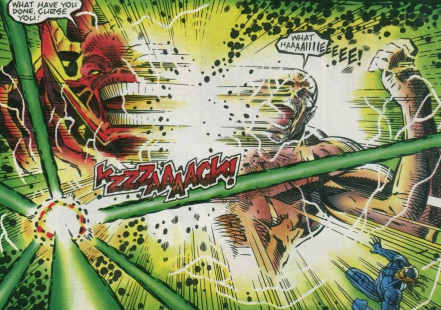 Death’s Head formed a high-tech cannon out of his liquid metal arm to retaliate, but Logan rammed his claws to a space by the barrel to stop it from firing! The result was one of Wolverine’s adamantium claws snapping completely off! (Unbreakable metal my amazing butt! What? I’ll have you know that I used to have quite the tight little derriere back in the day. Umm…..moving on whilst blushing profusely……) Logan stalled only momentarily before moving to strike once more! That was when Captain America’s commanding voice rang out to halt his attack. This creature wasn’t Charnel. The Avengers and Death’s Head’s group spend the next few minutes explaining who they are and describing their missions. As it seems that both teams want this Charnel creature dead, an alliance is formed. Good thing too. Because that was when Charnel chose to arrive! The first thing he did was take down the Scarlet Witch. She-Hulk leaped to attack next! She was caught in massive hands, her powerful neck broken quickly! Rhino charged the monstrous Charnel next! But the brute was only backhanded away like he was no more than a mere insect! Captain America’s body broke the titan’s fall! Death’s Head ran towards his enemy with a charging weapon/arm, but the cyborg missed his energy shot only to be hit by dark magical energies!