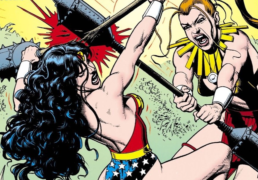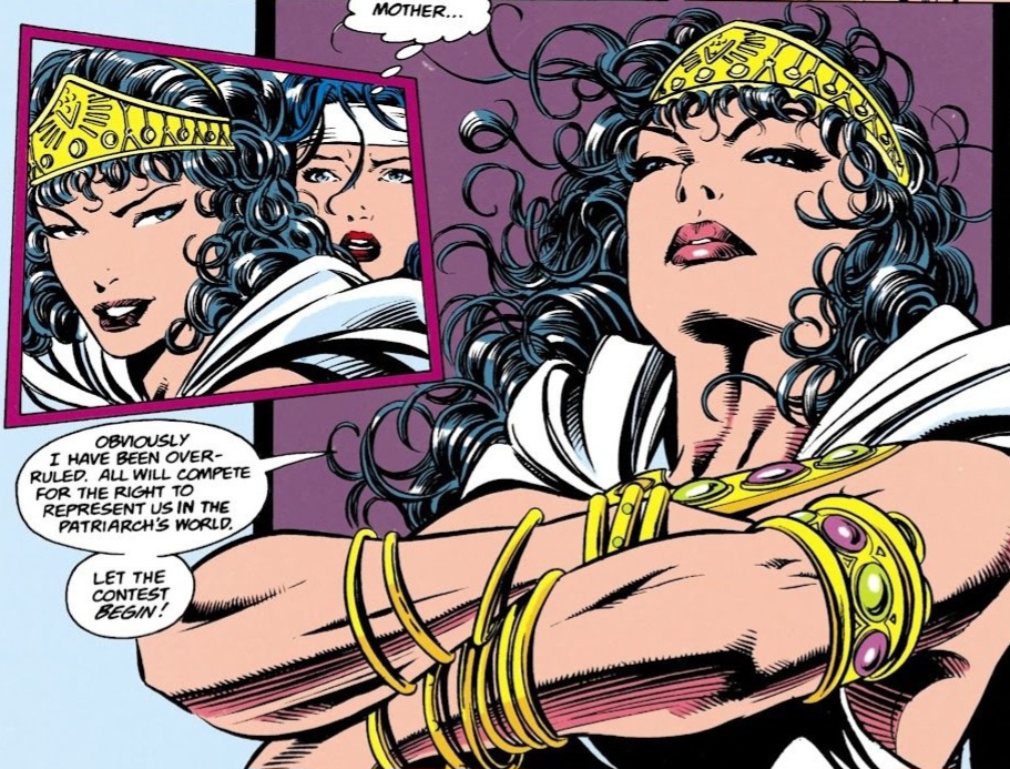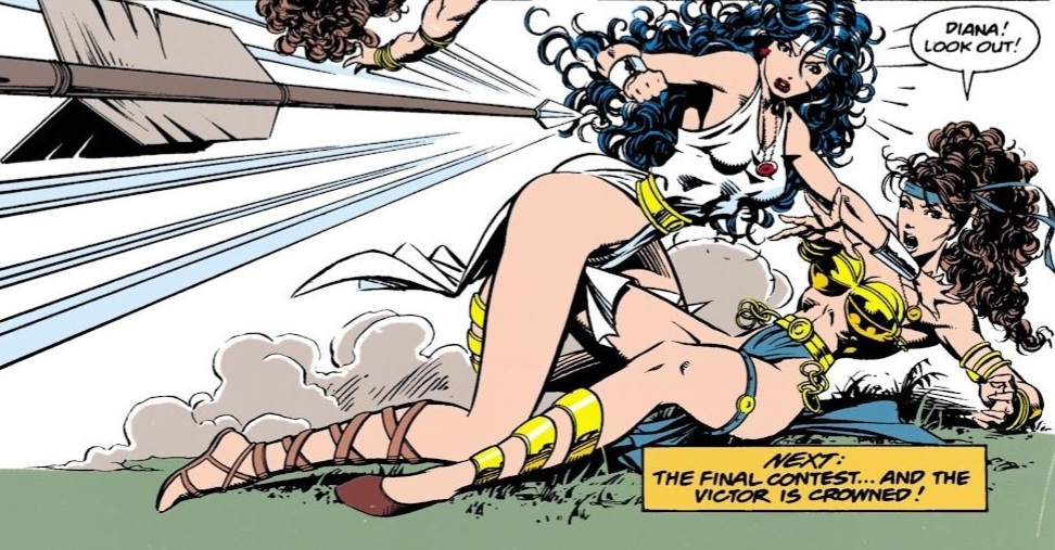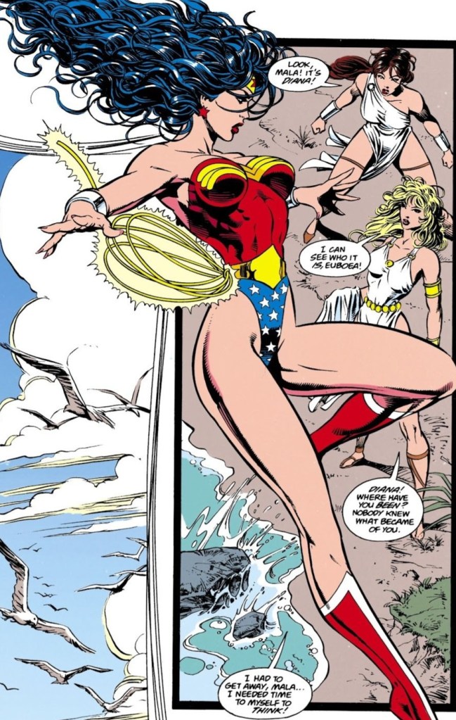 We begin with Princess Diana descending from the clear skies over Themyscira, dressed in full Wonder Woman garb. She gently lands on the beach, near some of her Amazonian sisters. A close friend, a blonde named Mala, admits that she was worried as Diana suddenly disappeared when her mother decreed that a new Contest would be held to decide the mantle of Wonder Woman once and for all. Diana merely replied that she needed time to think. She continued by asking sarcastically if a victor had been crowned while she was absent. (Reeeowr! A bit catty for this early in the article me thinks.) The other Amazon merely replied that she was being silly and handed her a typical outfit to compete within. She took it begrudgingly. Diana asked offhandedly if Artemis and the other once-exiled Amazons would be competing. The answer didn’t sound very positive.