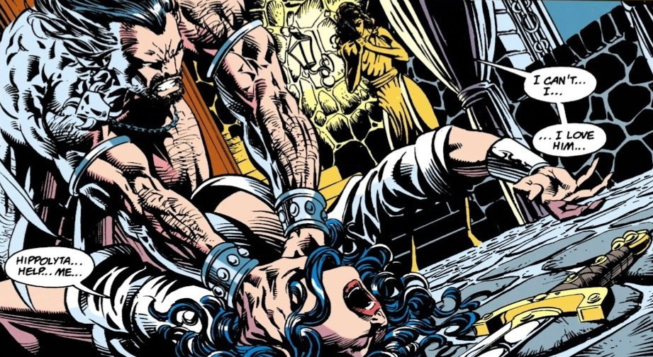The Amazons begin with javelin throwing, racing, feats of strength, hand to hand combat, etc. After, many of them decide to rest and recoup in the shade. Diana sits with her sisters and spies Artemis and her cohorts strolling by. She gives a friendly smile as she asks if they would like to join them. The reply is full of spite and disgust. The trio passes Diana and the others by as they make their own camp close by. Both groups sit and talk about one another into the night. (Girls. Am I right, fellas? Always gossiping and fighting. I guess it’s the same even on Paradise Island.) Suddenly, Diana holds her head in anguish as a vision forces it’s way into her mind! She sees the ancient past where it appears as though it wasn’t Hippolyta’s sister, Antiope, which betrayed her sister and the others to Herakles, but rather the other way around! Diana awakens near the campfire with a concerned Mala looking over her. She speaks very little of the vision to her friend. But she wonders about the truth of it silently to herself.