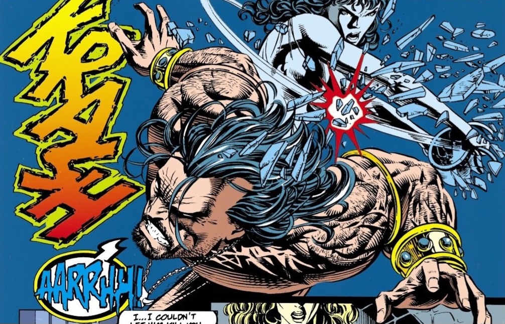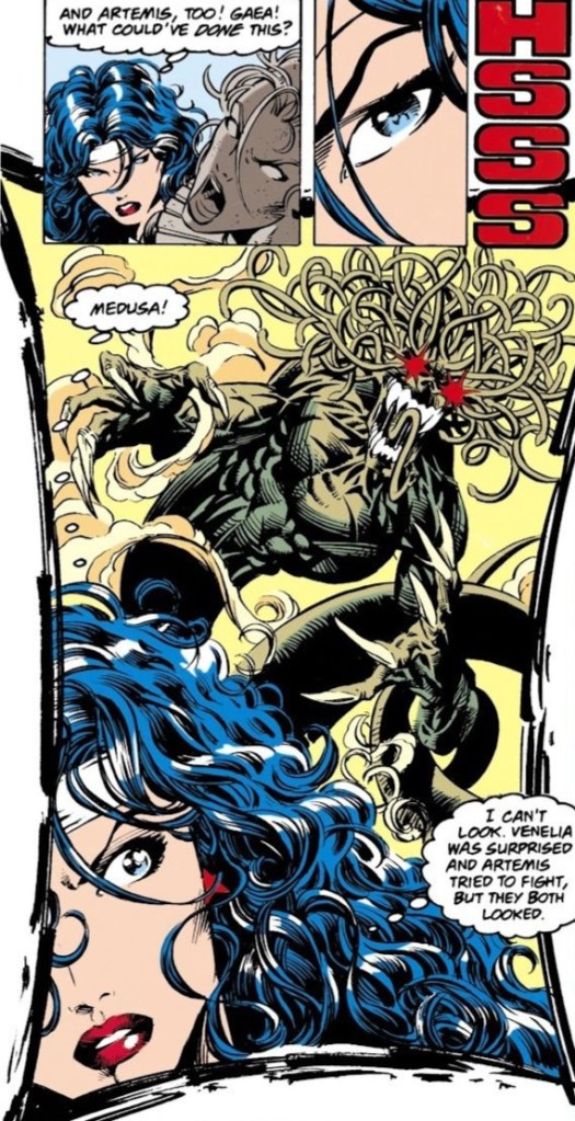 As Diana fought for air, another Amazon shot past her, downwards! Unless she could save her, she would be the first casualty of this whirling, wet vortex! Just then, Artemis grabbed the woman by her long hair and pulled her upward to safety! Diana fought against the mighty current herself but, just as she was making some headway, another vision of Herakles struck her like a fist! The demigod was choking the very life out of Hippolyta’s sister, Antiope! She screamed as loud she could for her sister’s aid! But Hippolyta merely hid, whispering that she could not. She loved him. But just before the last speck of life was about to drain from her sister, Hippolyta grabbed a nearby vase and shattered it over Herakles head, knocking him unconscious! Hippolyta helped her sister to her feet. Wasting little time, Antiope took a relic known as the Mask of Proteus and placed it over her own face. To all concerned, her female form magically became the body of Herakles himself! Using this front, she ordered Herakles’ men to stop their brutal attacks upon the Amazonian women at once or they would have to answer to him! They complied immediately. Antiope then handed Hippolyta the mask and ordered her to take it. For women needed to believe her to be the heroine this day if their new society was to succeed. Hippolyta refused at first, but finally relented. Antiope left the next day by boat. Her last words were that she would never trust her sister again. (Damn! Disney left this part out of the “Hercules” animated movie! “Zero to Hero”, my ass! )