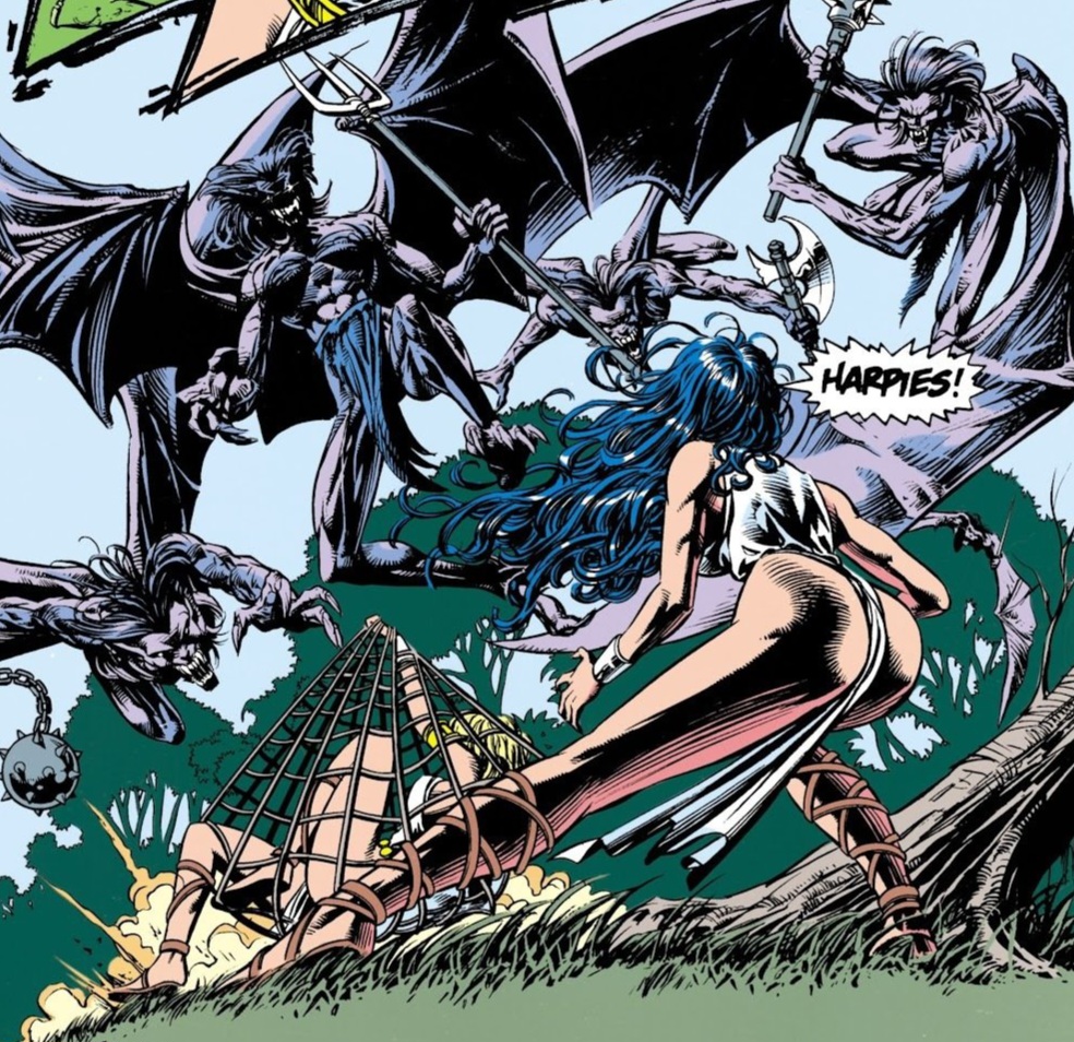 Wonder Woman awakens on precious, dry land and is helped to her feet by Artemis. But the red-head has little to say before sprinting off, back to the race. Diana warns another Amazon that that was no ordinary whirlpool, magic was most definitely in play. They had all better watch themselves carefully as the Contest continues. The two turn in just enough time for one to be ensnared by a thrown net! Winged Greek monstrosities, known as Harpies, descend upon their large, bat-like wings! They hiss as they swoop at their caught prey! Diana had rolled free of the net and prepared herself for battle! She wrenched a forked weapon from one and impaled the creature upon it! She knocked another one out with the weapon’s end! But Diana failed to see a second Harpy approaching her from behind! A well-placed arrow caught it through the throat! Diana turned to see her would-be assassin from earlier! Patrice gloated that they were now even! Diana ignored this and freed her sister-in-arms from the net as the other Harpies fled. (Sadly, even with today’s advanced technologies, there is no permanent cure for Harpies.) With hardly another word, Wonder Woman takes the net and pitchfork and speeds off!